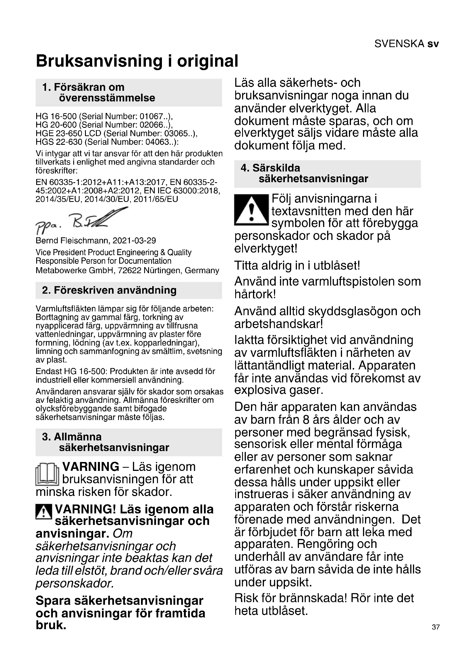 Bruksanvisning i original HG 16-500 (Serial Number: 01067..), HG 20-600 (Serial Number: 02066..), HGE 23-650 LCD (Serial Number: 03065..), HGS 22-630 (Serial Number: 04063..): Vi intygar att vi tar ansvar för att den här produkten tillverkats i enlighet med angivna standarder och föreskrifter: EN 60335-1:2012+A11:+A13:2017, EN 60335-2- 45:2002+A1:2008+A2:2012, EN IEC 63000:2018, 2014/35/EU, 2014/30/EU, 2011/65/EU Bernd Fleischmann, 2021-03-29 Vice President Product Engineering & Quality Responsible Person for Documentation Metabowerke GmbH, 72622 Nürtingen, Germany Varmluftsfläkten lämpar sig för följande arbeten: Borttagning av gammal färg, torkning av nyapplicerad färg, uppvärmning av tillfrusna vattenledningar, uppvärmning av plaster före formning, lödning (av t.ex. kopparledningar), limning och sammanfogning av smältlim, svetsning av plast. Endast HG 16-500: Produkten är inte avsedd för industriell eller kommersiell användning. Användaren ansvarar själv för skador som orsakas av felaktig användning. Allmänna föreskrifter om olycksförebyggande samt bifogade säkerhetsanvisningar måste följas. VARNING – Läs igenom bruksanvisningen för att minska risken för skador. VARNING! Läs igenom alla säkerhetsanvisningar och anvisningar. Om säkerhetsanvisningar och anvisningar inte beaktas kan det leda till elstöt, brand och/eller svåra personskador. Spara säkerhetsanvisningar och anvisningar för framtida bruk. Läs alla säkerhets- och bruksanvisningar noga innan du använder elverktyget. Alla dokument måste sparas, och om elverktyget säljs vidare måste alla dokument följa med. Följ anvisningarna i textavsnitten med den här symbolen för att förebygga personskador och skador på elverktyget! Titta aldrig in i utblåset! Använd inte varmluftspistolen som hårtork! Använd alltid skyddsglasögon och arbetshandskar! Iaktta försiktighet vid användning av varmluftsfläkten i närheten av lättantändligt material. Apparaten får inte användas vid förekomst av explosiva gaser. Den här apparaten kan användas av barn från 8 års ålder och av personer med begränsad fysisk, sensorisk eller mental förmåga eller av personer som saknar erfarenhet och kunskaper såvida dessa hålls under uppsikt eller instrueras i säker användning av apparaten och förstår riskerna förenade med användningen. Det är förbjudet för barn att leka med apparaten. Rengöring och underhåll av användare får inte utföras av barn såvida de inte hålls under uppsikt. Risk för brännskada! Rör inte det heta utblåset.
