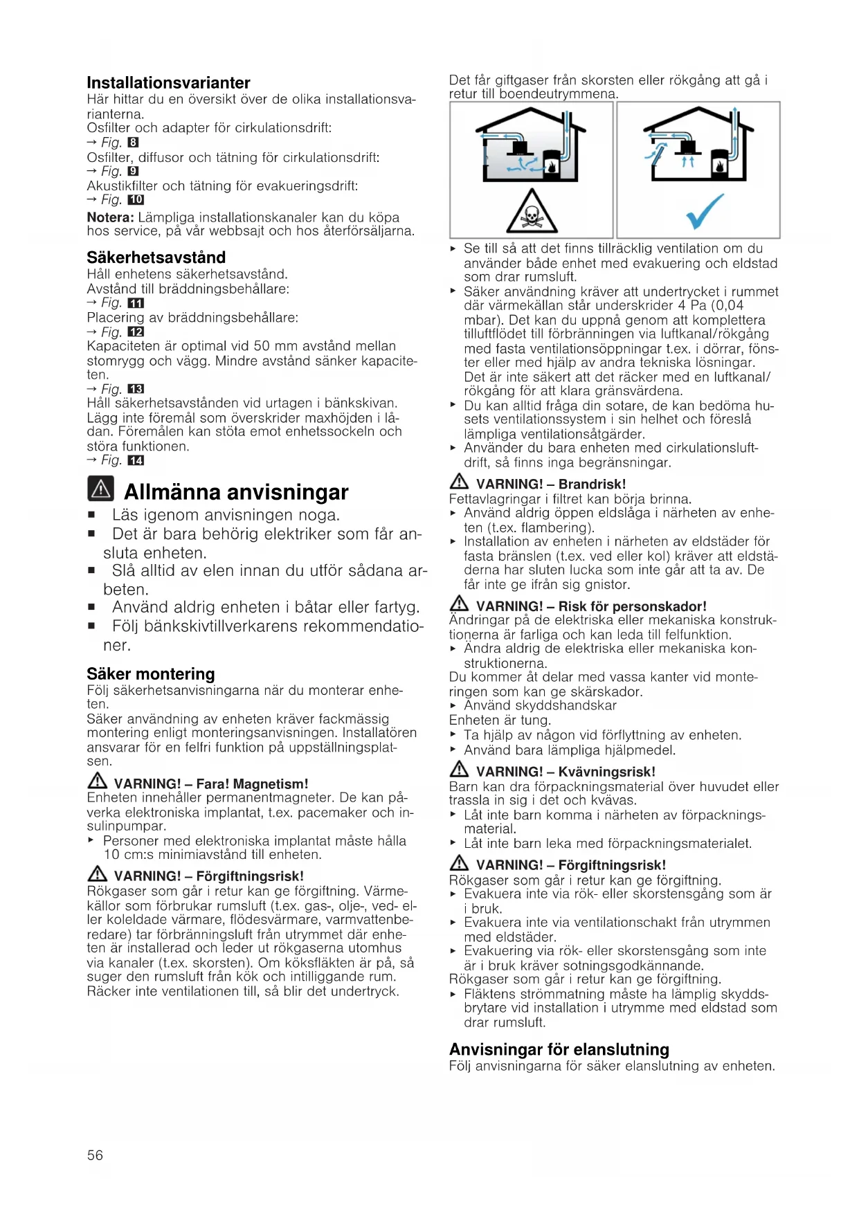 Personer med elektroniska implantat måste hålla 10cm:s minimiavstånd till enheten. VARNING!‒Förgiftningsrisk! Rökgaser som går i retur kan ge förgiftning. Värme- källor som förbrukar rumsluft (t.ex. gas-, olje-, ved- el- ler koleldade värmare, flödesvärmare, varmvattenbe- redare) tar förbränningsluft från utrymmet där enhe- ten är installerad och leder ut rökgaserna utomhus via kanaler (t.ex. skorsten). Om köksfläkten är på, så suger den rumsluft från kök och intilliggande rum. Räcker inte ventilationen till, så blir det undertryck. Det får giftgaser från skorsten eller rökgång att gå i retur till boendeutrymmena.