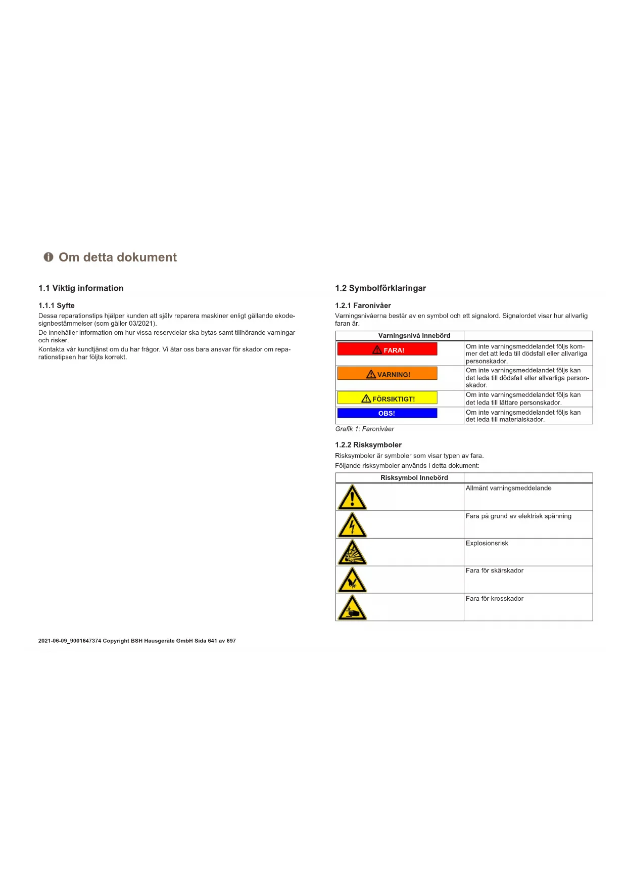 Följande allmänna symboler används i detta dokument: Allm. symbol Innebörd Identifiering av ett särskilt tips (text och/el- ler bild) Identifiering av ett enkelt tips (endast text) Allm. symbol Innebörd Identifiering av en länk till en videohand- ledning Identifiering av verktyg som behövs Identifiering av villkor som måste vara uppfyllda Identifiering av ett tillstånd (om ..., så ...) Identifiering av ett resultat Start Identifiering av en tangent eller knapp [00123456] Identifiering av ett materialnummer Status Identifiering av text/fönster som visas (i maskinens display) Grafik3: Allmänna symboler Om detta dokument 2021-06-09_9001647374 Copyright BSH Hausgeräte GmbH Sida642av697Säkerhet