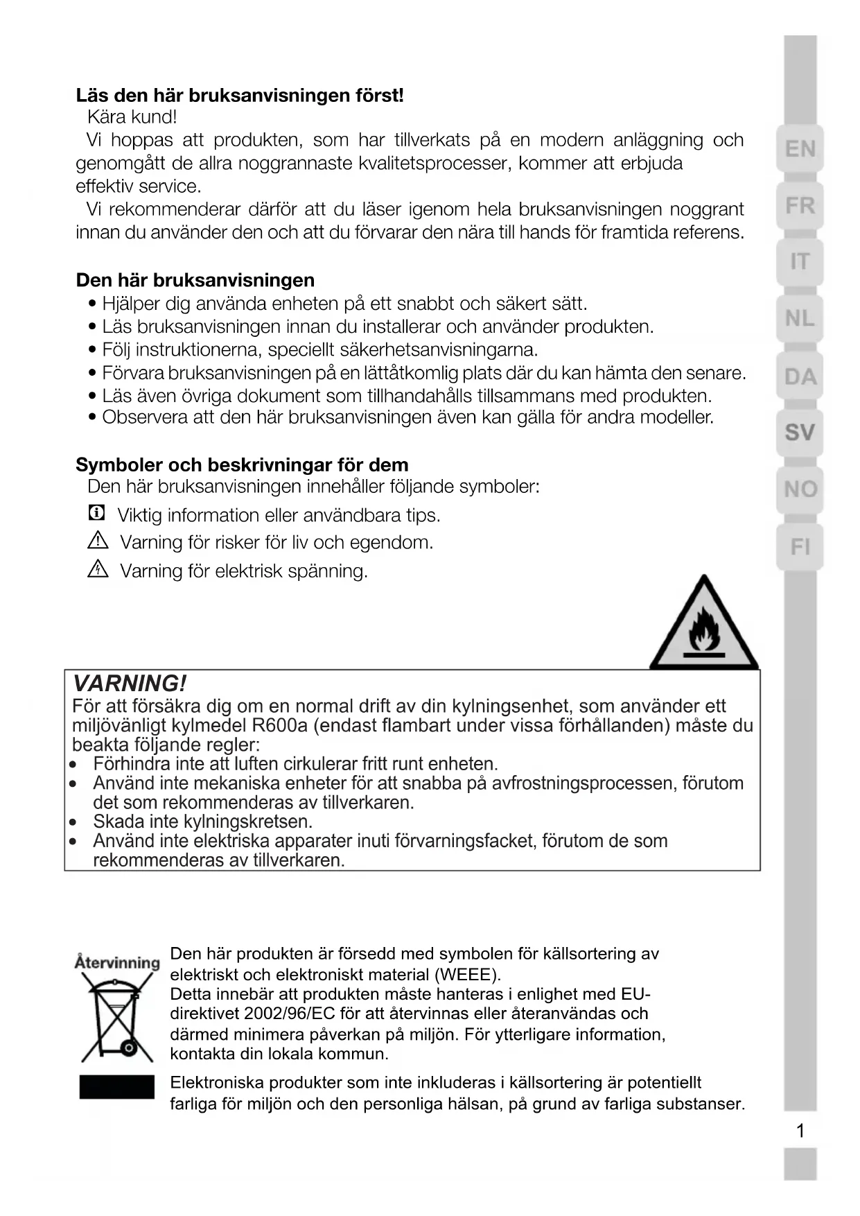 - Observera att den här bruksanvisningen även kan gälla för andra modeller. Symboler och beskrivningar för dem Den här bruksanvisningen innehåller följande symboler: C Viktig information eller användbara tips. A Varning för risker för liv och egendom. B Varning för elektrisk spänning. Den här produkten är försedd med symbolen för källsortering av elektriskt och elektroniskt material (WEEE). Detta innebär att produkten måste hanteras i enlighet med EU- direktivet 2002/96/EC för att återvinnas eller återanvändas och därmed minimera påverkan på miljön. För ytterligare information, kontakta din lokala kommun. Elektroniska produkter som inte inkluderas i källsortering är potentiellt farliga för miljön och den personliga hälsan, på grund av farliga substanser. VARNING! För att försäkra dig om en normal drift av din kylningsenhet, som använder ett miljövänligt kylmedel R600a (endast flambart under vissa förhållanden) måste du beakta följande regler: