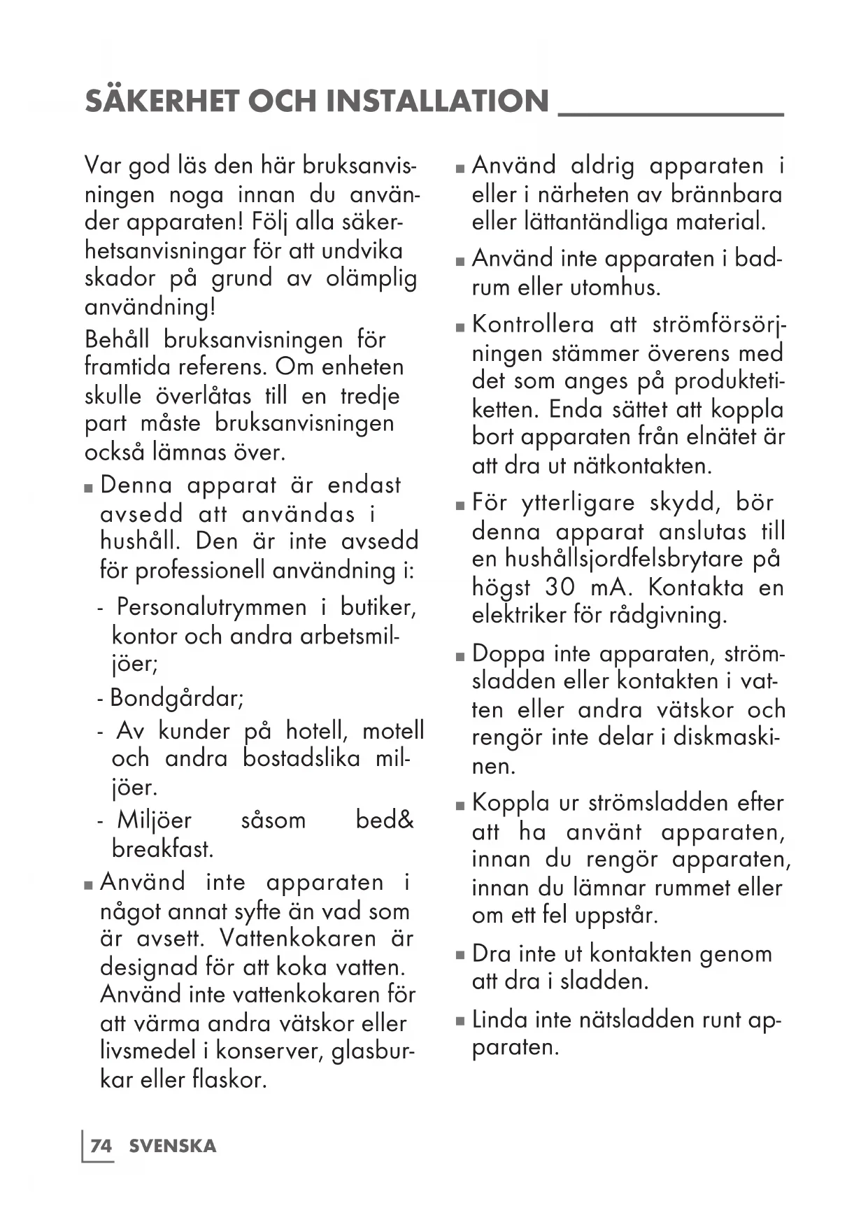 Använd inte apparaten i något annat syfte än vad som är avsett. Vattenkokaren är designad för att koka vatten. Använd inte vattenkokaren för att värma andra vätskor eller livsmedel i konserver, glasbur- kar eller flaskor.
