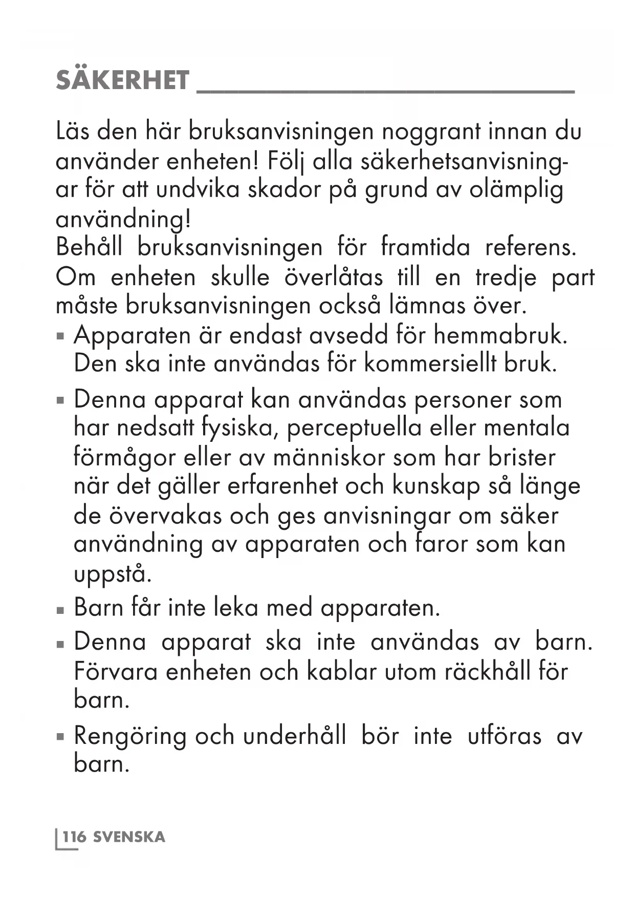 Rengöring och underhåll bör inte utföras av barn.SVENSKA 117 SÄKERHET ___________________________