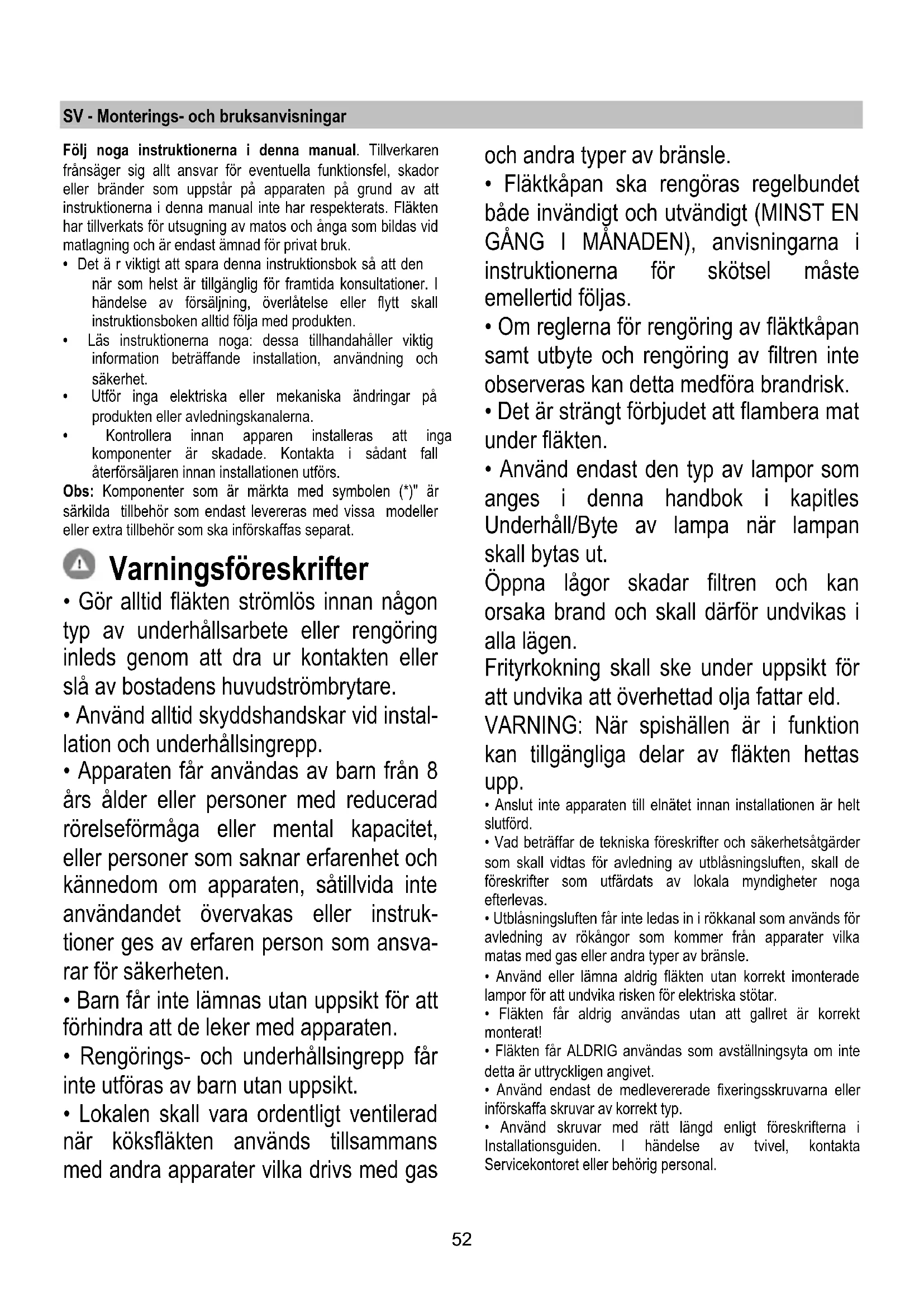 Για την αντικατάσταση τους, απευθυνθείτε στην υπηρεσία τεχνικής βοήθειας52 SV - Monterings- och bruksanvisningar Följ noga instruktionerna i denna manual. Tillverkaren frånsäger sig allt ansvar för eventuella funktionsfel, skador eller bränder som uppstår på apparaten på grund av att instruktionerna i denna manual inte har respekterats. Fläkten har tillverkats för utsugning av matos och ånga som bildas vid matlagning och är endast ämnad för privat bruk.