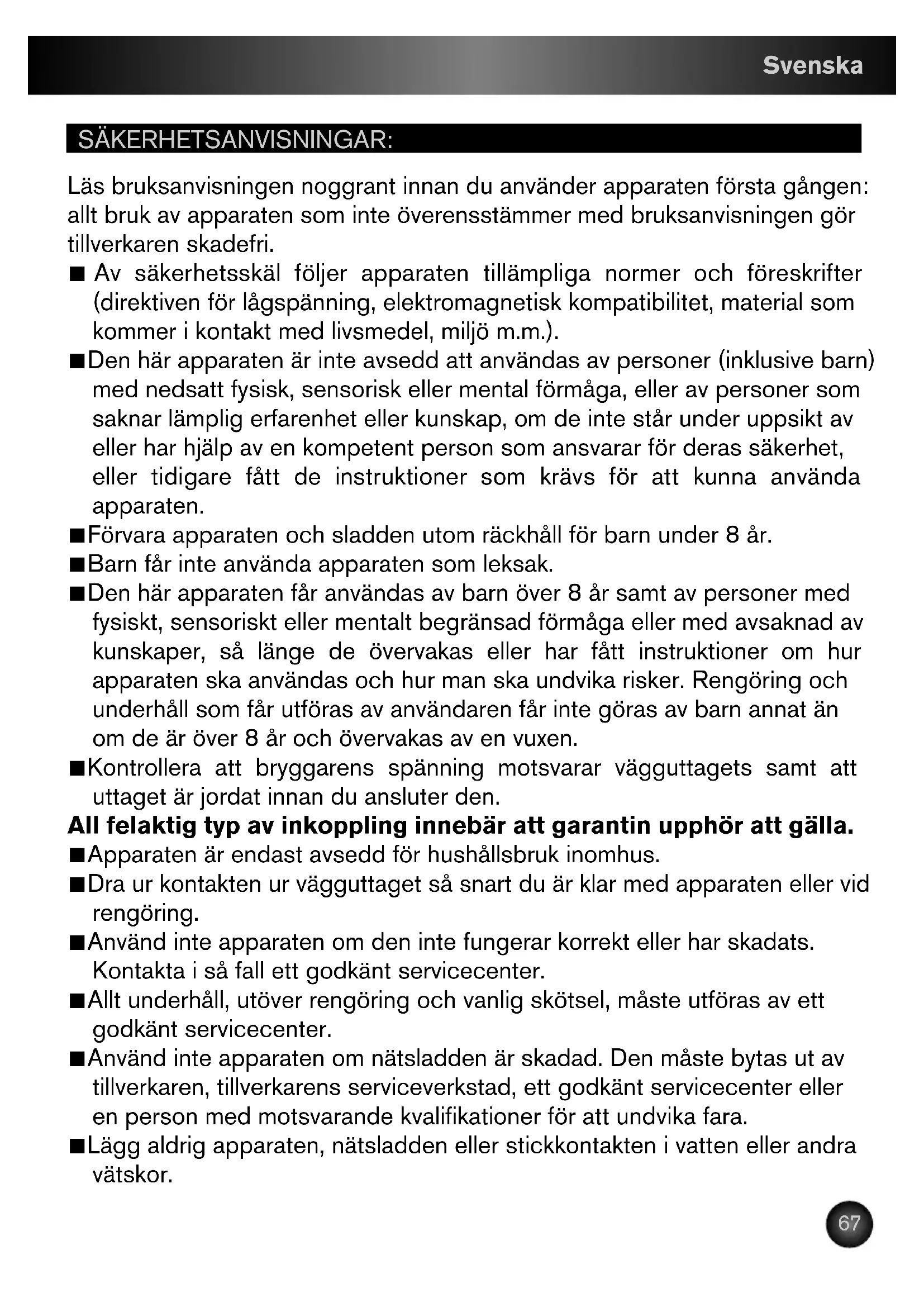 KR_CAFETIERE_CAFE-ET-LATTE_NC00120110_Miseenpage119/06/1315:06Page66SÄKERHETSANVISNINGAR: Läs bruksanvisningen noggrant innan du använder apparaten första gången: allt bruk av apparaten som inte överensstämmer med bruksanvisningen gör tillverkaren skadefri. ■ Av säkerhetsskäl följer apparaten tillämpliga normer och föreskrifter (direktiven för lågspänning, elektromagnetisk kompatibilitet, material som kommer i kontakt med livsmedel, miljö m.m.). ■ Den här apparaten är inte avsedd att användas av personer (inklusive barn) med nedsatt fysisk, sensorisk eller mental förmåga, eller av personer som saknar lämplig erfarenhet eller kunskap, om de inte står under uppsikt av eller har hjälp av en kompetent person som ansvarar för deras säkerhet, eller tidigare fått de instruktioner som krävs för att kunna använda apparaten. ■ Förvara apparaten och sladden utom räckhåll för barn under 8 år. ■ Barn får inte använda apparaten som leksak. ■ Den här apparaten får användas av barn över 8 år samt av personer med fysiskt, sensoriskt eller mentalt begränsad förmåga eller med avsaknad av kunskaper, så länge de övervakas eller har fått instruktioner om hur apparaten ska användas och hur man ska undvika risker. Rengöring och underhåll som får utföras av användaren får inte göras av barn annat än om de är över 8 år och övervakas av en vuxen. ■ Kontrollera att bryggarens spänning motsvarar vägguttagets samt att uttaget är jordat innan du ansluter den. All felaktig typ av inkoppling innebär att garantin upphör att gälla. ■ Apparaten är endast avsedd för hushållsbruk inomhus. ■ Dra ur kontakten ur vägguttaget så snart du är klar med apparaten eller vid rengöring. ■ Använd inte apparaten om den inte fungerar korrekt eller har skadats. Kontakta i så fall ett godkänt servicecenter. ■ Allt underhåll, utöver rengöring och vanlig skötsel, måste utföras av ett godkänt servicecenter. ■ Använd inte apparaten om nätsladden är skadad. Den måste bytas ut av tillverkaren, tillverkarens serviceverkstad, ett godkänt servicecenter eller en person med motsvarande kvalifikationer för att undvika fara. ■ Lägg aldrig apparaten, nätsladden eller stickkontakten i vatten eller andra vätskor. Svenska
