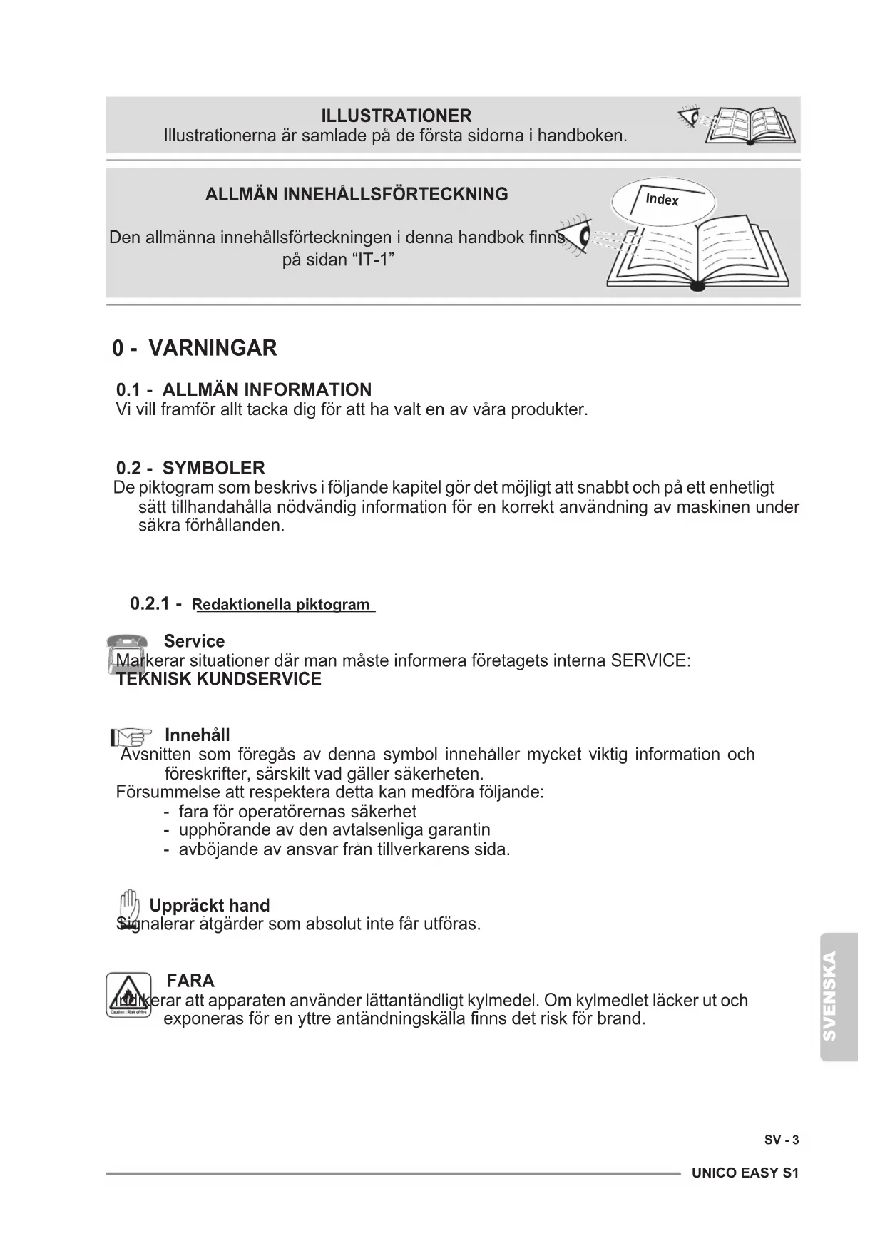Service Markerar situationer där man måste informera företagets interna SERVICE: TEKNISK KUNDSERVICE Innehåll Avsnitten som föregås av denna symbol innehåller mycket viktig information och föreskrifter, särskilt vad gäller säkerheten. Försummelse att respektera detta kan medföra följande: - fara för operatörernas säkerhet - upphörande av den avtalsenliga garantin - avböjande av ansvar från tillverkarens sida. Uppräckt hand Signalerar åtgärder som absolut inte får utföras. FARA Indikerar att apparaten använder lättantändligt kylmedel. Om kylmedlet läcker ut och exponerasförenyttreantändningskällannsdetriskförbrand. Index