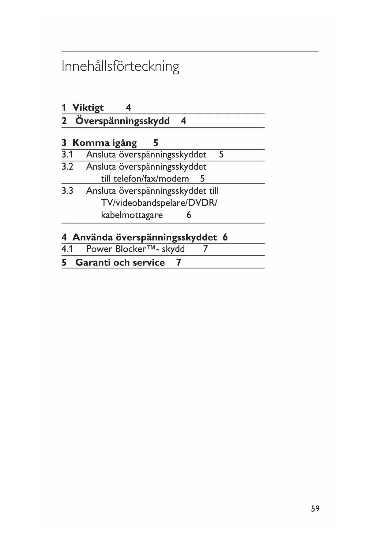 - Demonteraellerreparerainteprodukten. Kassera förpackningen på en lokal återvinningsstation. Bruksanvisning, ”konsumentinformation” Kassering av din gamla produkt Produktenharutvecklatsochtillverkats avhögkvalitativamaterialochkomponenter somgårattåtervinnaochåteranvända. Närdenhärsymbolenmedenöverkryssad papperskorgvisaspåprodukteninnebärdet attproduktenomfattasavdeteuropeiska direktivet2002/96/EG. Taredapåvardukanhittanärmaste återvinningsstationförelektriskaoch elektroniskaprodukter. Handlaenligtlokalareglerochslänginte gamlaprodukterihushållssoporna.Rätt kasseringavgamlaprodukterhjälpertillatt förhindrapotentielltnegativakonsekvenser förmiljönochmänsklighälsa. 2 Överspän- ningsskydd Grattistillköpetochvälkommentill Philips! Omduvilldrafullständignyttaavden supportsomPhilipserbjuderregistrerar duproduktenpå: www.philips.com/welcome. Överspänningsskyddetharutformatsföratt skyddaanslutenutrustningmotelektriska skador.Philipserbjuderettfullständigt sortimentavöverspänningsskyddför attskyddadinhemelektronikochdina datorsystem. Viktiga produktuppgifter Överspänningsskyddetkanvarautrustatmed någonavföljandefunktioner. Power Blocker™-skydd Stängeravströmmentillnätuttagvid överspänningsomslårutskyddet. Halvledarskydd för telefon/fax/modem Germaximaltskyddmotöverspänningi vanliga”uppringda”telefontjänstermedtvå ledningar.61 Skydd för telefonlinjedelare Delardeninkommandetelefonlinjenitvå utgångar,såatttelefonenochmodemet skyddas. Skydd för koaxialkabel Germaximaltskyddmotöverspänningi vanligakoaxial-/bredbandsledningar. Lysdiodsindikator för att visa att skyddet fungerar Informerardigomöverspänningsskyddets status. 3 Komma igång Idethäravsnittetfårduhjälpmedförstagångs- installationenavöverspänningsskyddet.