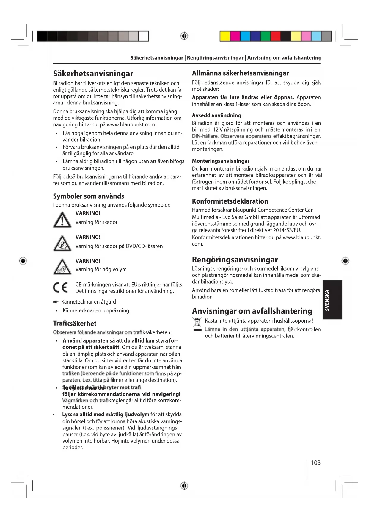 - Lyssna alltid med måttlig ljudvolym för att skydda din hörsel och för att kunna höra akustiska varnings- signaler (t.ex. polissirener). Vid ljudavstängnings- pauser (t.ex. vid byte av ljudkälla) är förändringen av volymen inte hörbar. Höj inte volymen under dessa perioder. Allmänna säkerhetsanvisningar Följ nedanstående anvisningar för att skydda dig själv mot skador: Apparaten får inte ändras eller öppnas. Apparaten innehåller en klass 1-laser som kan skada dina ögon. Avsedd användning Bilradion är gjord för att monteras och användas i en bil med 12 V nätspänning och måste monteras in i en ektbegränsningar. Låt en fackman utföra reparationer och vid behov även monteringen. Monteringsanvisningar Du kan montera in bilradion själv, men endast om du har erfarenhet av att montera bilradioapparater och är väl förtrogen inom området fordonsel. Följ kopplingssche- mat i slutet av bruksanvisningen. Konformitetsdeklaration Rengöringsanvisningar Lösnings-, rengörings- och skurmedel liksom vinylglans och plastrengöringsmedel kan innehålla medel som ska- dar bilradions yta. Använd bara en torr eller lätt fuktad trasa för att rengöra bilradion. Anvisningar om avfallshantering Kasta inte uttjänta apparater i hushållssoporna! ärrkontrollen och batterier till återvinningscentralen. Härmed försäkrar Blaupunkt Competence Center Car Multimedia - Evo Sales GmbH att apparaten är utformad i överensstämmelse med grund läggande krav och övri- ga relevanta föreskrifter i direktivet 2014/53/EU. Konformitetsdeklarationen hittar du på www.blaupunkt. com. CE-märkningen visar att EU:s riktlinjer har följts. Det nns inga restriktioner för användning.104 Levererade komponenter Följande komponenter ingår vid leverans: