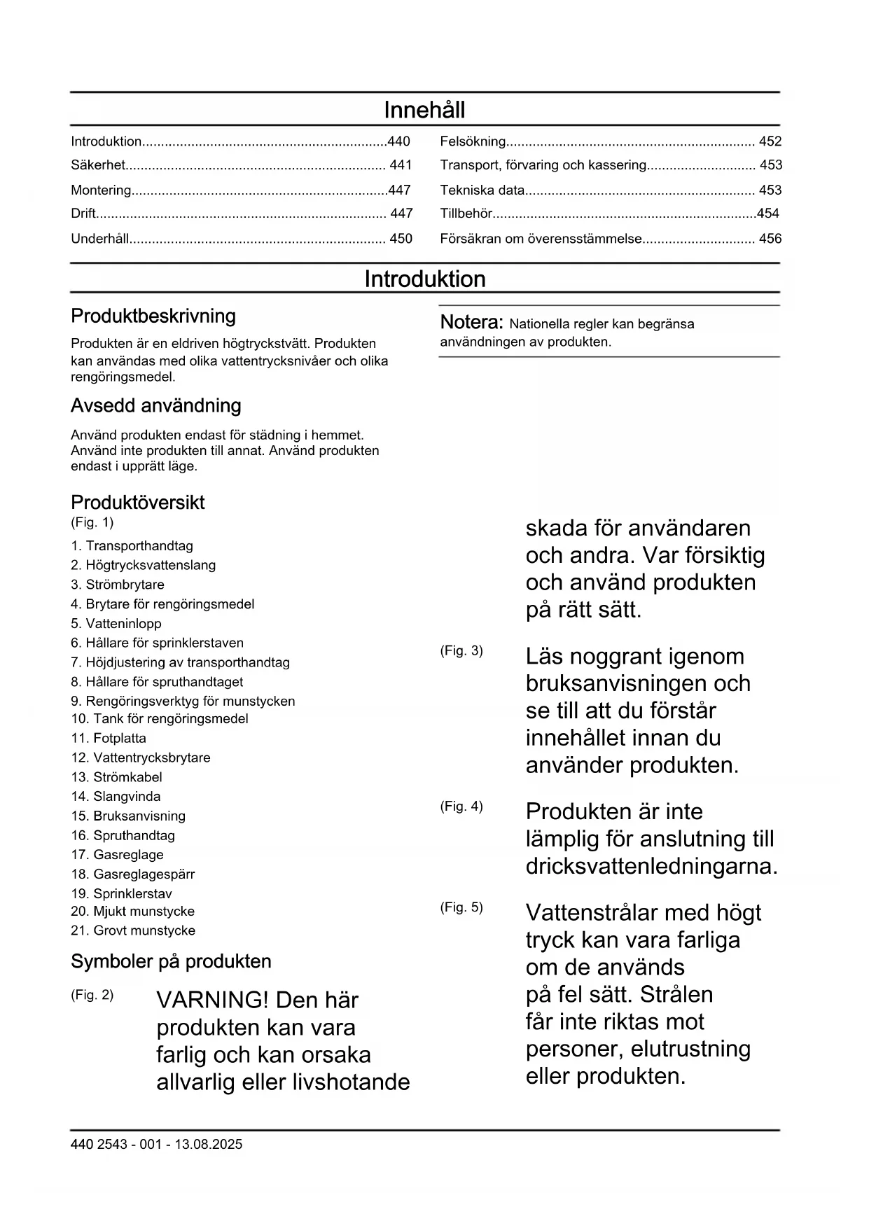 Symboler på produkten (Fig. 2) VARNING! Den här produkten kan vara farlig och kan orsaka allvarlig eller livshotande skada för användaren och andra. Var försiktig och använd produkten på rätt sätt. (Fig. 3) Läs noggrant igenom bruksanvisningen och se till att du förstår innehållet innan du använder produkten. (Fig. 4) Produkten är inte lämplig för anslutning till dricksvattenledningarna. (Fig. 5) Vattenstrålar med högt tryck kan vara farliga om de används på fel sätt. Strålen får inte riktas mot personer, elutrustning eller produkten. 440 2543 - 001 - 13.08.2025(Fig. 6) Miljömärkning. Produkten eller dess förpackning är inte hushållsavfall. Återvinn den vid en godkänd plats för kassering av elektrisk och elektronisk utrustning. (Fig. 7) Verktyg i klass II. (Fig. 8) Miljömärkning för bulleremission enligt direktiv och bestämmelser för EU och Storbritannien samt New South Wales-lagstiftningen ”Protection of the Environment Operations (Noise Control) Regulations 2017”. Produktens garanterade ljudeffektnivå anges i Tekniska data på sida