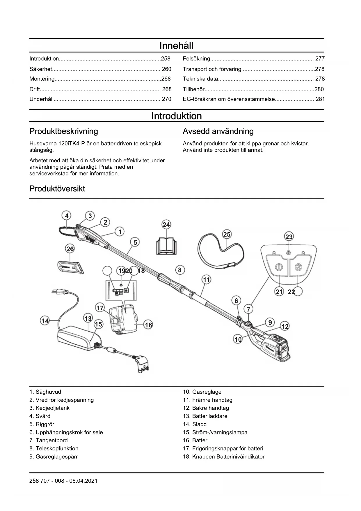 - EG‐försäkran om överensstämmelse Introduktion Produktbeskrivning Husqvarna 120iTK4-P är en batteridriven teleskopisk stångsåg. Arbetet med att öka din säkerhet och effektivitet under användning pågår ständigt. Prata med en serviceverkstad för mer information. Avsedd användning Använd produkten för att klippa grenar och kvistar. Använd inte produkten till annat. Produktöversikt p. 281
