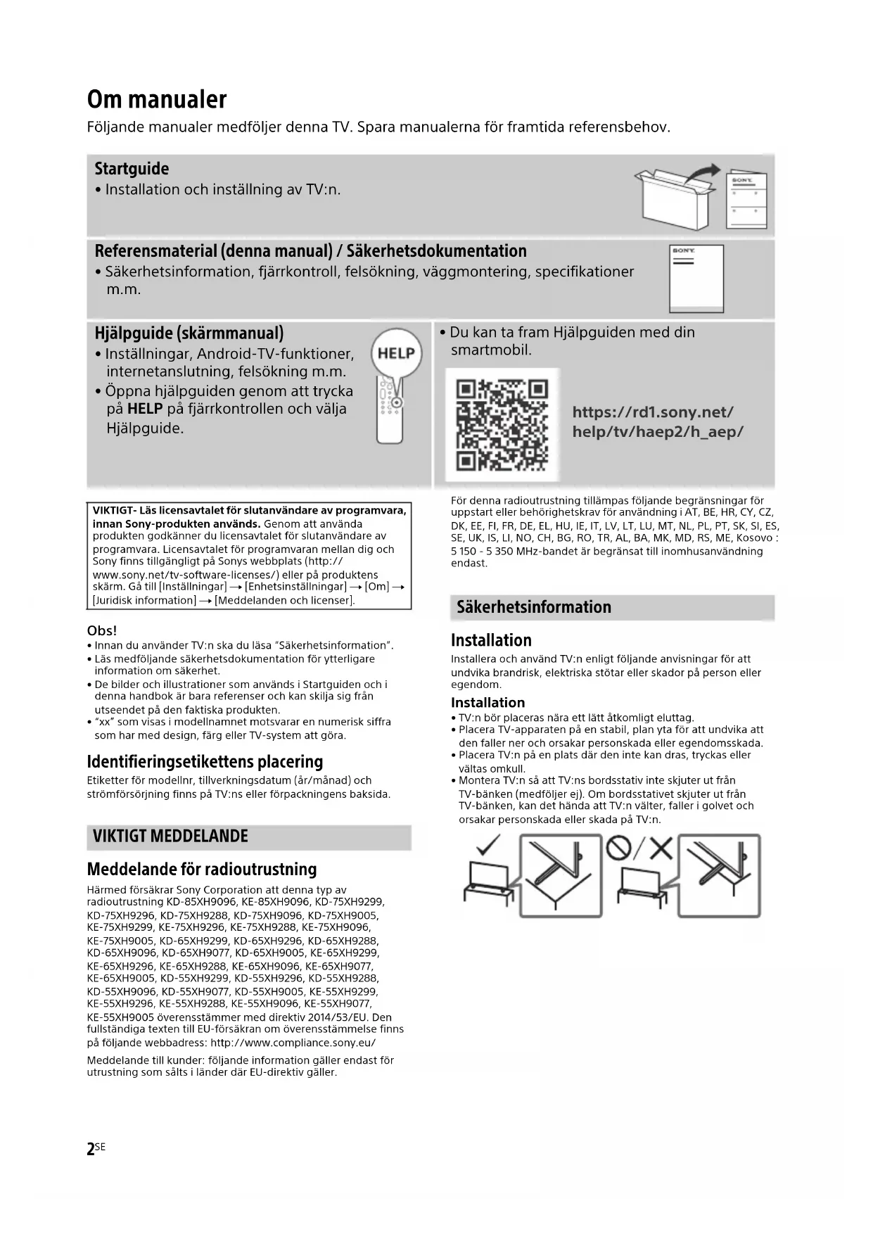 - Innan du använder TV:n ska du läsa “Säkerhetsinformation”.• Läs medföljande säkerhetsdokumentation för ytterligare information om säkerhet.• De bilder och illustrationer som används i Startguiden och i denna handbok är bara referenser och kan skilja sig från utseendet på den faktiska produkten.• “xx” som visas i modellnamnet motsvarar en numerisk siffra som har med design, färg eller TV-system att göra. Identifieringsetikettens placering Etiketter för modellnr, tillverkningsdatum (år/månad) och strömförsörjning finns på TV:ns eller förpackningens baksida. VIKTIGT MEDDELANDE Meddelande för radioutrustning Härmed försäkrar Sony Corporation att denna typ av radioutrustning KD-85XH9096, KE-85XH9096, KD-75XH9299, KD-75XH9296, KD-75XH9288, KD-75XH9096, KD-75XH9005, KE-75XH9299, KE-75XH9296, KE-75XH9288, KE-75XH9096, KE-75XH9005, KD-65XH9299, KD-65XH9296, KD-65XH9288, KD-65XH9096, KD-65XH9077, KD-65XH9005, KE-65XH9299, KE-65XH9296, KE-65XH9288, KE-65XH9096, KE-65XH9077, KE-65XH9005, KD-55XH9299, KD-55XH9296, KD-55XH9288, KD-55XH9096, KD-55XH9077, KD-55XH9005, KE-55XH9299, KE-55XH9296, KE-55XH9288, KE-55XH9096, KE-55XH9077, KE-55XH9005 överensstämmer med direktiv 2014/53/EU. Den fullständiga texten till EU-försäkran om överensstämmelse finns på följande webbadress: http://www.compliance.sony.eu/Meddelande till kunder: följande information gäller endast för utrustning som sålts i länder där EU-direktiv gäller.För denna radioutrustning tillämpas följande begränsningar för uppstart eller behörighetskrav för användning i AT, BE, HR, CY, CZ, DK, EE, FI, FR, DE, EL, HU, IE, IT, LV, LT, LU, MT, NL, PL, PT, SK, SI, ES, SE, UK, IS, LI, NO, CH, BG, RO, TR, AL, BA, MK, MD, RS, ME, Kosovo :5 150 - 5 350 MHz-bandet är begränsat till inomhusanvändning endast. Säkerhetsinformation Installation Installera och använd TV:n enligt följande anvisningar för att undvika brandrisk, elektriska stötar eller skador på person eller egendom. Installation