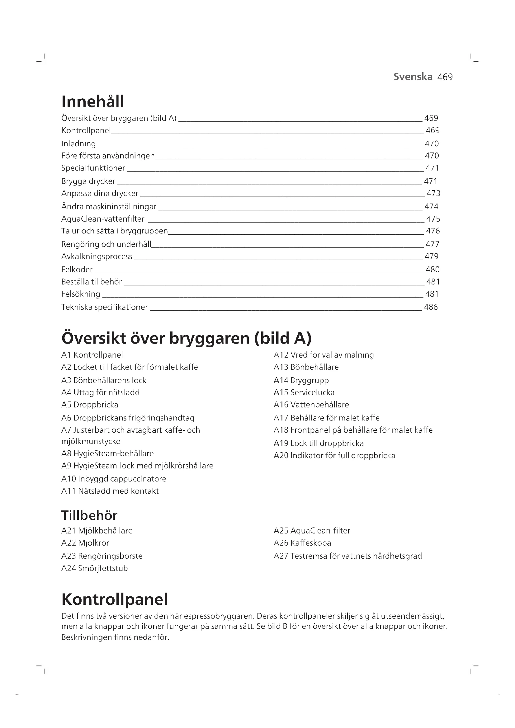 Svenska Innehåll Översikt över bryggaren (bild A) ____________________________________________________________ 469 Kontrollpanel_____________________________________________________________________________ 469 Inledning ________________________________________________________________________________ 470 Före första användningen__________________________________________________________________ 470 Specialfunktioner _________________________________________________________________________ 471 Brygga drycker ___________________________________________________________________________ 471 Anpassa dina drycker ______________________________________________________________________ 473 Ändra maskininställningar _________________________________________________________________ 474 AquaClean-vattenfilter ____________________________________________________________________ 475 Ta ur och sätta i bryggruppen_______________________________________________________________ 476 Rengöring och underhåll___________________________________________________________________ 477 Avkalkningsprocess _______________________________________________________________________ 479 Felkoder _________________________________________________________________________________ 480 Beställa tillbehör __________________________________________________________________________ 481 Felsökning _______________________________________________________________________________ 481 Tekniska specifikationer ___________________________________________________________________ 486 Översikt över bryggaren (bild A) A1 Kontrollpanel A2 Locket till facket för förmalet kaffe A3 Bönbehållarens lock A4 Uttag för nätsladd A5 Droppbricka A6 Droppbrickans frigöringshandtag A7 Justerbart och avtagbart kaffe- och mjölkmunstycke A8 HygieSteam-behållare A9 HygieSteam-lock med mjölkrörshållare A10 Inbyggd cappuccinatore A11 Nätsladd med kontakt A12 Vred för val av malning A13 Bönbehållare A14 Bryggrupp A15 Servicelucka A16 Vattenbehållare A17 Behållare för malet kaffe A18 Frontpanel på behållare för malet kaffe A19 Lock till droppbricka A20 Indikator för full droppbricka Tillbehör A21 Mjölkbehållare A22 Mjölkrör A23 Rengöringsborste A24 Smörjfettstub A25 AquaClean-filter A26 Kaffeskopa A27 Testremsa för vattnets hårdhetsgrad Kontrollpanel Det finns två versioner av den här espressobryggaren. Deras kontrollpaneler skiljer sig åt utseendemässigt, men alla knappar och ikoner fungerar på samma sätt. Se bild B för en översikt över alla knappar och ikoner. Beskrivningen finns nedanför.470 Svenska Bläddra i displayen med uppåt- och nedåtpilarna och tryck på OK för att välja eller bekräfta ditt val. B1 På/av-knapp B2 Dryckesikoner B3 CoffeeMaestro-ikon B4 Meny med fler drycker B5 Start/stopp-knapp B6 Navigeringsikoner (uppåt, nedåt, bakåt, ok) B7 Display B8 Bryggarinställningar B9 Rengöringsmeny B10 Personliga profiler Inledning Grattis till ditt köp av en helautomatisk Saeco-kaffemaskin! För att dra maximal nytta av den onlinesupport som Saeco erbjuder går du till www.saeco.com/MyCoffeeMachine för att registrera din produkt. Obs! Den här bryggaren har testats med riktigt kaffe. Även om den har rengjorts mycket noggrant kan det finnas vissa kafferester kvar. Men, vi garanterar dig att din bryggare är helt ny. Före första användningen