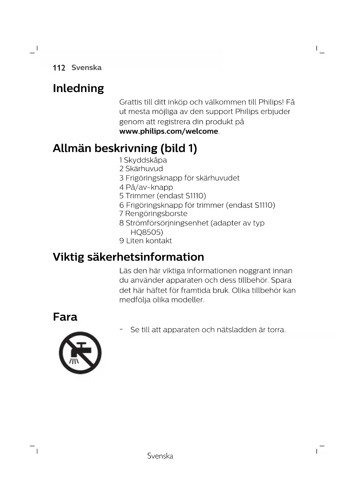 SuomiSvenska Inledning Grattis till ditt inköp och välkommen till Philips! Få ut mesta möjliga av den support Philips erbjuder genom att registrera din produkt på www.philips.com/welcome. Allmän beskrivning (bild 1) 1 Skyddskåpa 2 Skärhuvud 3 Frigöringsknapp för skärhuvudet 4 På/av-knapp 5 Trimmer (endast S1110) 6 Frigöringsknapp för trimmer (endast S1110) 7 Rengöringsborste 8 Strömförsörjningsenhet (adapter av typ HQ8505) 9 Liten kontakt Viktig säkerhetsinformation Läs den här viktiga informationen noggrant innan du använder apparaten och dess tillbehör. Spara det här häftet för framtida bruk. Olika tillbehör kan medfölja olika modeller. Fara