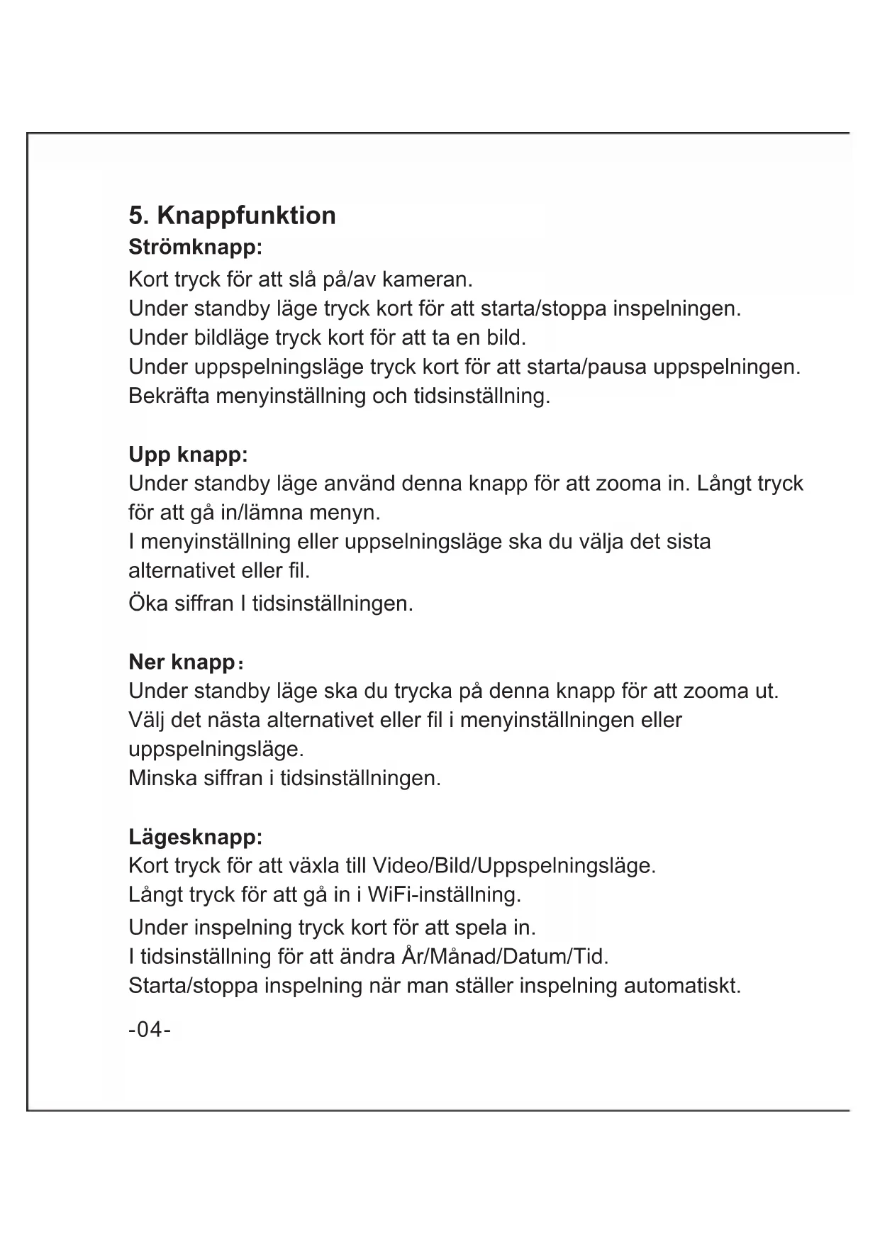 I standby läge tryck på lägesknappen för att växla till uppspelningsläge. Tryck på UPP eller NER knappen för att välja den önskade videon/bilden och tryck på strömknappen för att förhandstitta eller spela upp den valda filen. Tryck på strömknappen för att stoppa uppspelningen! Menyinställning Med ett långt tryck på uppknappen kan du gå in i menyläget. Tryck på lägesknappen för att växla från menyläget till systeminställningarna. Tryck på nerknappen för att gå ner på sidan, tryck på uppknappen för att gå upp på sidan. Tryck på strömknappen för att bekräfta ditt val. Tryck på uppknappen under en längre tid för att lämna menyn. Video-, bild-, och uppspelningsläge har två menyer: lägesmeny och systemmeny. Systemmenyerna är alltid de samma. Vänligen se följande Information för att hitta den önskade funktionen i menyn: Videomeny: Filmstorlek: 4k 10bps/1440p 30bps/1080p 60bps/1080p 50bps/1080p 30bps/1080p 25bps/720p 120bps/720P 60bps/720p 50bps/720p 30bps /720p25bps/VGA 240bps Videokvalitet: superfin/fin/normal Smidigt: Av/1 minut/3 minuter/5 minuter Slow Motion: Av/Auto Tidsintervall: Av/0.5sek/1sek/3sek/5sek/10sek/30sek/1min Vit balans: Auto/dagsljus/molnigt/glödlampa/fluor-09- Dykningsläge: av/på Exponering: -2.0, -1.0, +0.0, +1.0, +2.0 Tagningstid: Av/5s/10s/15s/30s/60s Rörelsedetektering: av/på Datumstämpel: av/datum/datum och tid Bildmeny: Upplösning: 12M/8M/5M/3M Vit balans: Auto/dagsljus/molnigt/glödlampa/fluor H Exponering: -2.0, -1.0, +0.0, +1.0, +2.0 Timertagning: av/2s/10s/30s/60s/dubbel Periodisk snäpp: av/0.5s/1s/2s/ 3s Bildbristning: av/3 bilder/5 bilder/10 bilder Uppspelningslägesmeny: Vänligen välj filtypen! Video JPG Skydd: enkel/skydda alla/ta bort skydd från alla Ta bort: enkel/alla Systemmeny: Ljud: pip (på/av) / Volym (0/1/2/3) röstinspelning (H/M/L/av) Strömfrekvens: 50Hz/60Hz/Auto Ström spar: Av/1 min/3 min/5 min Datum och tid: 02/06/2012 19:17 År/Månad/Dag Språk: tyska, engelska, franska, italienska, spanska, portugisiska, holländska, grekiska, polska, tjeckiska, slovakiska, danska, svenska, norska, finska, ungerska-10- Invertläge: Av/På WiFi lösenord: 1234567890 Tidszoner: -12 till +12 Tidszon 0 är Greenwich tiden, vänligen kontrollera din tidszon för att ställa in den rätta tiden på din kamera. TV ut: Ja/Nej Fjärrpar: Av/På Format: Ja/Nej System: Fabriksåterställning/Systeminfo/Kortinfo Fjärrkontrollbeskrivning Det finns två knappar på fjärrkontrollen. Tryck på videoknappen för att starta/stoppa inspelningen. Tryck på bildknappen för att ta bilder under bildläge eller spela in under videoläge. Video Bild Vänligen observera att fjärrkontrollen innehåller ett CR 2032 cellbatteri.För att byta ut batteriet ska man skruva upp de fyra skruvarna på fjärrkontrollens baksida.-11- Matcha fjärrkontrollen Ställ in "Fjärrparning" i menyn på “på”, fortsätt tryck de två knapparna på fjärrkontrollen. Du kan se den blåa LED blinka på fjärrkontrollen. Släpp de två knapparna efter 3 sekunder. Fjärrkontrollen borde bli parad nu. Tryck på strömknappen på kameran för att lämna fjärrparningen och återvända till förhandstittläget. Försök att spela in en video eller ta en bild med fjärrkontrollen. Vänligen upprepa parningen om fjärrkontrollen I nte kan börja spela in! Installera och använda WiFi
