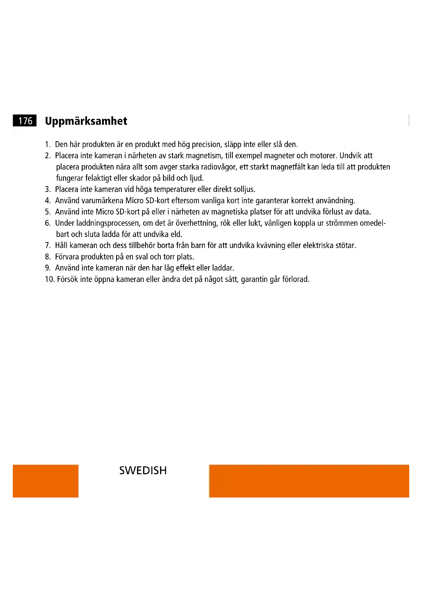 10. Försök inte öppna kameran eller ändra det på något sätt, garantin går förlorad.177