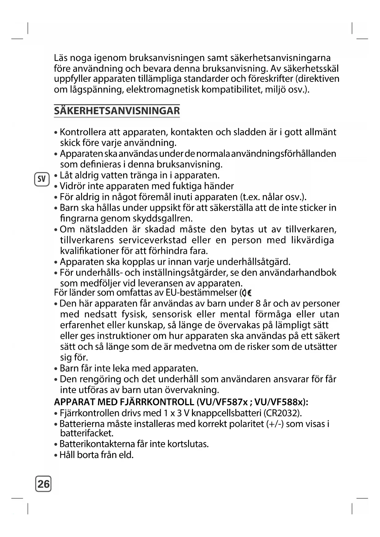 - Den rengöring och det underhåll som användaren ansvarar för får inte utföras av barn utan övervakning. APPARAT MED FJÄRRKONTROLL (VU/VF587x ; VU/VF588x):