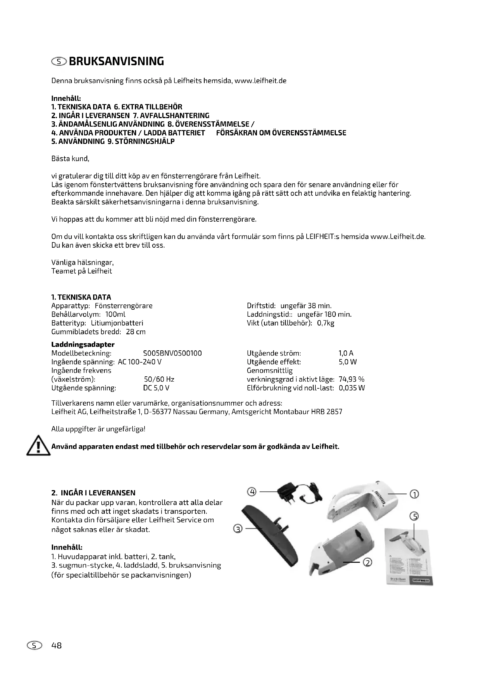 Apparattyp: Fönsterrengörare Behållarvolym: 100ml Batterityp: Litiumjonbatteri Gummibladets bredd: 28 cm Driftstid: ungefär 38 min. Laddningstid:: ungefär 180 min. Vikt (utan tillbehör): 0,7kg Tillverkarens namn eller varumärke, organisationsnummer och adress: Leifheit AG, Leifheitstraße 1, D-56377 Nassau Germany, Amtsgericht Montabaur HRB 2857 Alla uppgifter är ungefärliga! Använd apparaten endast med tillbehör och reservdelar som är godkända av Leifheit. Laddningsadapter Modellbeteckning: S005BNV0500100 Ingående spänning: AC 100-240 V Ingående frekvens (växelström): 50/60 Hz Utgående spänning: DC 5,0 V Utgående ström: 1,0 A Utgående effekt: 5,0 W Genomsnittlig verkningsgrad i aktivt läge: 74,93 % Elförbrukning vid noll-last: 0,035 W49