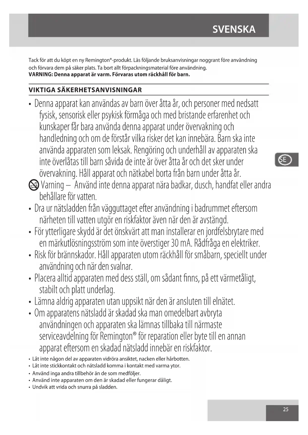 - Om apparatens nätsladd är skadad ska man omedelbart avbryta användningen och apparaten ska lämnas tillbaka till närmaste serviceavdelning för Remington® för reparation eller byte till en annan apparat eftersom en skadad nätsladd innebär en riskfaktor.