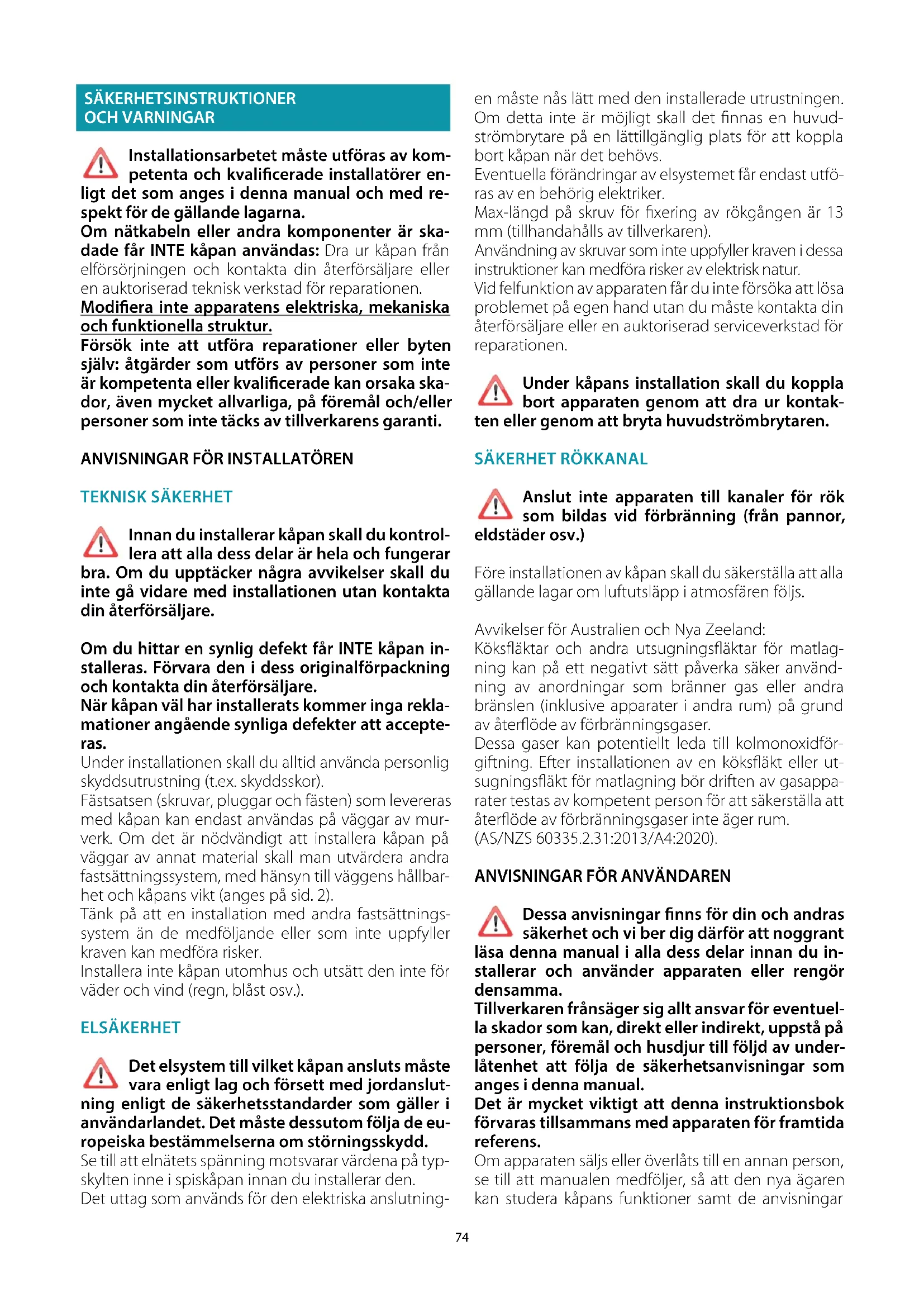 Symbolet med den overstregede skraldespand er kun gyldigt i EU-medlemslan- de: Vi anbefaler vores kunder at tage kontakt til de lokale myndigheder, eller til forretningen hvor apparatet er købt, for nærmere oplysninger vedrørende den korrekte bortskaffelse. PAS PÅ! Producenten forbeholder sig ret til at foretage ændringer på udstyret, til enhver tid og uden varsel. Genoptryk, oversættelse og reproduktion, også delvis, af den- ne vejledning er underlagt tilladelse fra fabrikanten. De tekniske informationer, de grafiske gengivelser og specifikationerne i denne vejledning er vejledende og må ikke offentliggøres. Vejledningen er blevet udformet på italiensk og Fabrikanten fralægger sig ansva- ret for eventuel fejlagtig afskrivning eller oversættelse.74 SÄKERHETSINSTRUKTIONER OCH VARNINGAR Installationsarbetet måste utföras av kom- petenta och kvalicerade installatörer en- ligt det som anges i denna manual och med re- spekt för de gällande lagarna. Om nätkabeln eller andra komponenter är ska- dade får INTE kåpan användas: Dra ur kåpan från elförsörjningen och kontakta din återförsäljare eller en auktoriserad teknisk verkstad för reparationen. Modiera inte apparatens elektriska, mekaniska och funktionella struktur. Försök inte att utföra reparationer eller byten själv: åtgärder som utförs av personer som inte är kompetenta eller kvalicerade kan orsaka ska- dor, även mycket allvarliga, på föremål och/eller personer som inte täcks av tillverkarens garanti.