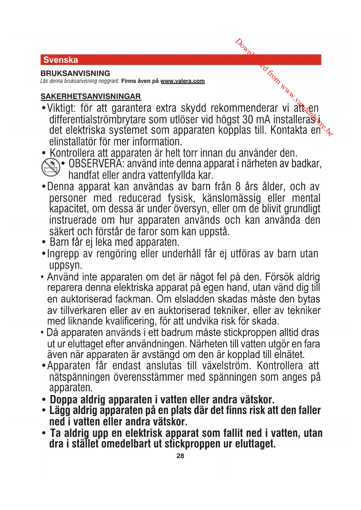 om reparationer görs av icke auktoriserade personer. Om fel uppstår ska apparaten återsändas väl emballerad tillsammans med ett daterat garantibevis som ska vara stämplat av återförsäljaren. Apparaten ska sändas till något av våra auktoriserade Servicecenter eller till återförsäljaren, som i sin tur sedan sörjer för att apparaten skickas vidare till den officiella importören för garantireparation. VIKTIGT INGEN av de hårtorkar som listas här är lämplig för installation och användning på allmän plats, gym, wellness/fitness-center, klubbar, spa, osv. med stor folkgenomströmning. För installation och användning på allmän plats, gym, wellness/fitness-center, klubbar, spa, osv. med liten folkgenomströmning, rekommenderar Valera enbart följande modeller SN9000 P • 583.11/P • 584.02/IP. VALERA är ett registrerat Ligo Electric S.A. varumärke - Schweiz 00060674_settembre 2014:Layout 1 09/09/2014 8.46 Pagina 30 Downloaded from www.vandenborre.be31 Suomi KAYTTOOHJEET Lue huolellisesti nämä käyttöohjeet. Saatavana myös osoitteesta www.valera.com TURVALLISUUSOHJEET