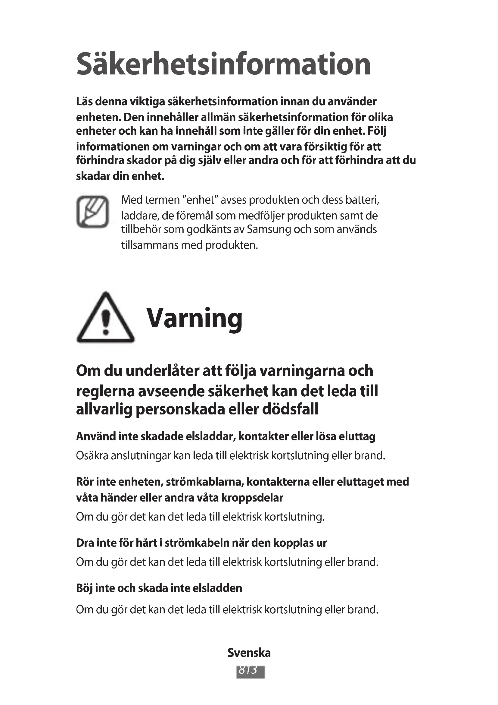 Säkerhetsinformation Läs denna viktiga säkerhetsinformation innan du använder enheten. Den innehåller allmän säkerhetsinformation för olika enheter och kan ha innehåll som inte gäller för din enhet. Följ informationen om varningar och om att vara försiktig för att förhindra skador på dig själv eller andra och för att förhindra att du skadar din enhet. Med termen ”enhet” avses produkten och dess batteri, laddare, de föremål som medföljer produkten samt de tillbehör som godkänts av Samsung och som används tillsammans med produkten. Varning Om du underlåter att följa varningarna och reglerna avseende säkerhet kan det leda till allvarlig personskada eller dödsfall Använd inte skadade elsladdar, kontakter eller lösa eluttag Osäkra anslutningar kan leda till elektrisk kortslutning eller brand. Rör inte enheten, strömkablarna, kontakterna eller eluttaget med våta händer eller andra våta kroppsdelar Om du gör det kan det leda till elektrisk kortslutning. Dra inte för hårt i strömkabeln när den kopplas ur Om du gör det kan det leda till elektrisk kortslutning eller brand. Böj inte och skada inte elsladden Om du gör det kan det leda till elektrisk kortslutning eller brand.Svenska