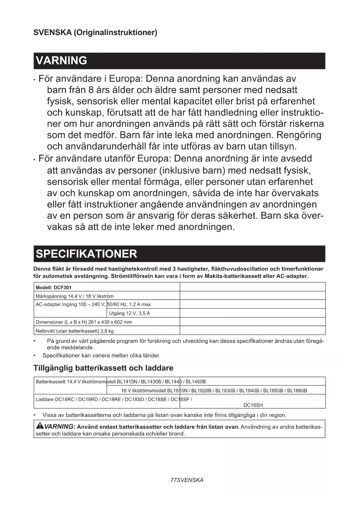 - För användare utanför Europa: Denna anordning är inte avsedd att användas av personer (inklusive barn) med nedsatt fysisk, sensorisk eller mental förmåga, eller personer utan erfarenhet av och kunskap om anordningen, såvida de inte har övervakats eller fått instruktioner angående användningen av anordningen av en person som är ansvarig för deras säkerhet. Barn ska över- vakas så att de inte leker med anordningen. SPECIFIKATIONER Denna äkt är försedd med hastighetskontroll med 3 hastigheter, äkthuvudoscillation och timerfunktioner för automatisk avstängning. Strömtillförseln kan vara i form av Makita-batterikassett eller AC-adapter. Modell: DCF301Märkspänning 14,4 V / 18 V likströmAC-adapter Ingång 100 – 240 V, 50/60 Hz, 1,2 A maxUtgång 12 V, 3,5 ADimensioner (L x B x H) 261 x 439 x 602 mmNettovikt (utan batterikassett) 3,8 kg