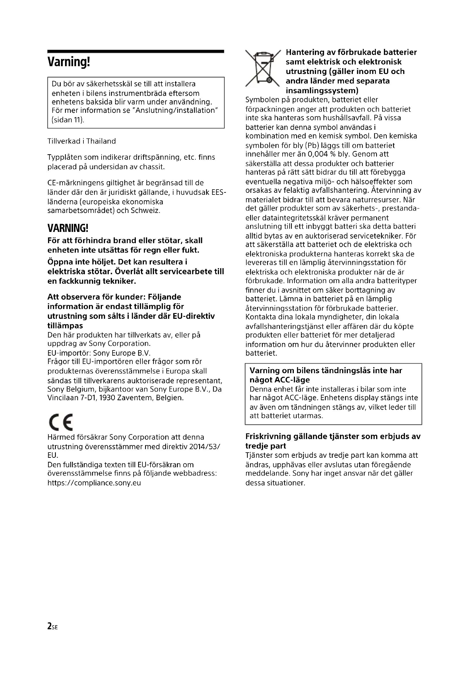 Naar het dashboard / de middenconsoleOnderdelen die met uw auto worden bijgeleverd BeugelBeugel De zekering vervangen Zekering (10 A)2SE Varning! Tillverkad i Thailand Typplåten som indikerar driftspänning, etc. finns placerad på undersidan av chassit. CE-märkningens giltighet är begränsad till de länder där den är juridiskt gällande, i huvudsak EES- länderna (europeiska ekonomiska samarbetsområdet) och Schweiz. VARNING! För att förhindra brand eller stötar, skall enheten inte utsättas för regn eller fukt. Öppna inte höljet. Det kan resultera i elektriska stötar. Överlåt allt servicearbete till en fackkunnig tekniker. Att observera för kunder: Följande information är endast tillämplig för utrustning som sålts i länder där EU-direktiv tillämpas Den här produkten har tillverkats av, eller på uppdrag av Sony Corporation. EU-importör: Sony Europe B.V. Frågor till EU-importören eller frågor som rör produkternas överensstämmelse i Europa skall sändas till tillverkarens auktoriserade representant, Sony Belgium, bijkantoor van Sony Europe B.V., Da Vincilaan 7-D1, 1930 Zaventem, Belgien. Härmed försäkrar Sony Corporation att denna utrustning överensstämmer med direktiv 2014/53/ EU. Den fullständiga texten till EU-försäkran om överensstämmelse finns på följande webbadress: https://compliance.sony.eu Hantering av förbrukade batterier samt elektrisk och elektronisk utrustning (gäller inom EU och andra länder med separata insamlingssystem) Symbolen på produkten, batteriet eller förpackningen anger att produkten och batteriet inte ska hanteras som hushållsavfall. På vissa batterier kan denna symbol användas i kombination med en kemisk symbol. Den kemiska symbolen för bly (Pb) läggs till om batteriet innehåller mer än 0,004 % bly. Genom att säkerställa att dessa produkter och batterier hanteras på rätt sätt bidrar du till att förebygga eventuella negativa miljö- och hälsoeffekter som orsakas av felaktig avfallshantering. Återvinning av materialet bidrar till att bevara naturresurser. När det gäller produkter som av säkerhets-, prestanda- eller dataintegritetsskäl kräver permanent anslutning till ett inbyggt batteri ska detta batteri alltid bytas av en auktoriserad servicetekniker. För att säkerställa att batteriet och de elektriska och elektroniska produkterna hanteras korrekt ska de levereras till en lämplig återvinningsstation för elektriska och elektroniska produkter när de är förbrukade. Information om alla andra batterityper finner du i avsnittet om säker borttagning av batteriet. Lämna in batteriet på en lämplig återvinningsstation för förbrukade batterier. Kontakta dina lokala myndigheter, din lokala avfallshanteringstjänst eller affären där du köpte produkten eller batteriet för mer detaljerad information om hur du återvinner produkten eller batteriet. Friskrivning gällande tjänster som erbjuds av tredje part Tjänster som erbjuds av tredje part kan komma att ändras, upphävas eller avslutas utan föregående meddelande. Sony har inget ansvar när det gäller dessa situationer. Du bör av säkerhetsskäl se till att installera enheten i bilens instrumentbräda eftersom enhetens baksida blir varm under användning. För mer information se ”Anslutning/installation” (sidan 11). Varning om bilens tändningslås inte har något ACC-läge Denna enhet får inte installeras i bilar som inte har något ACC-läge. Enhetens display stängs inte av även om tändningen stängs av, vilket leder till att batteriet utarmas.3SE Försiktighet