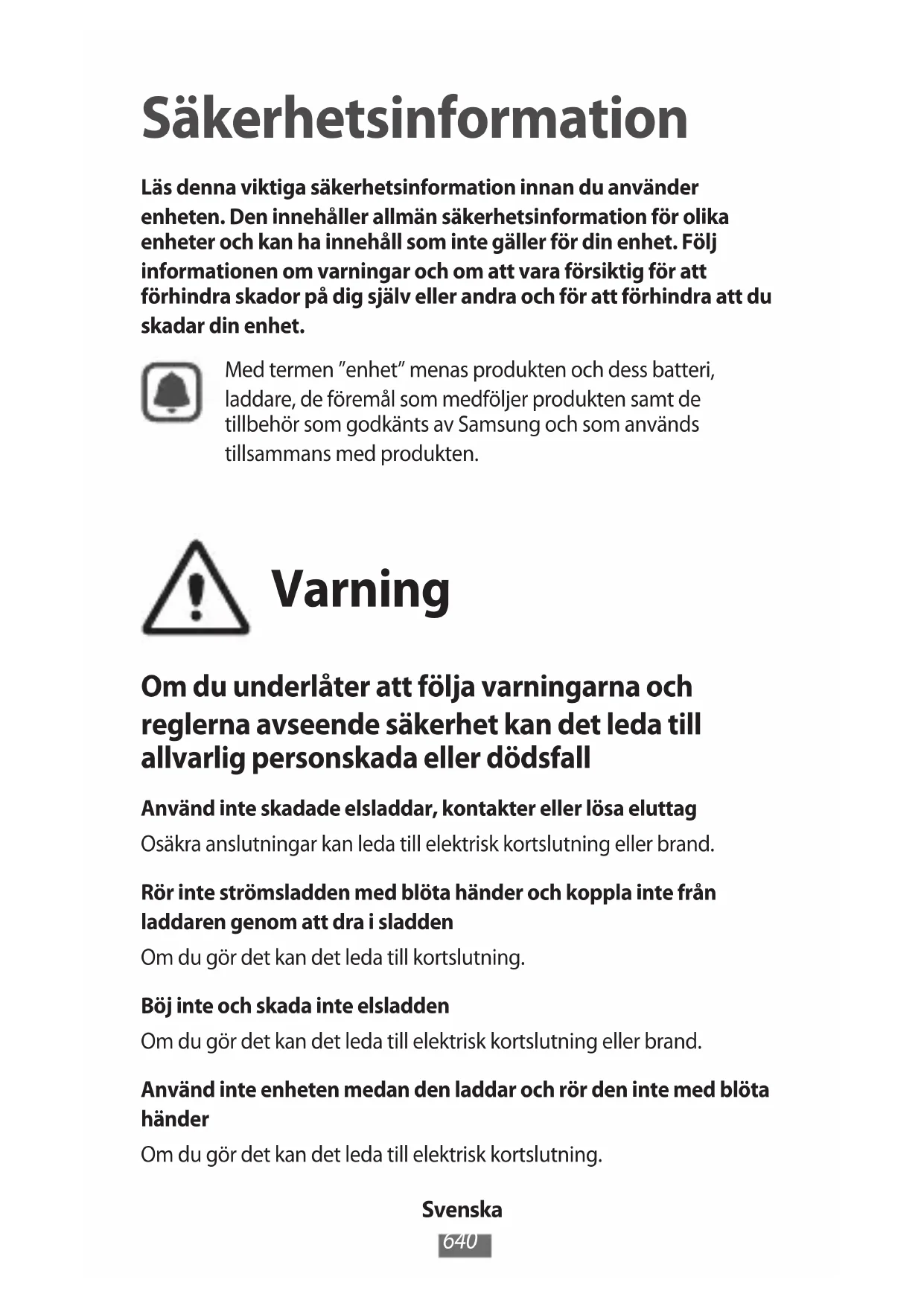 Säkerhetsinformation Läs denna viktiga säkerhetsinformation innan du använder enheten. Den innehåller allmän säkerhetsinformation för olika enheter och kan ha innehåll som inte gäller för din enhet. Följ informationen om varningar och om att vara försiktig för att förhindra skador på dig själv eller andra och för att förhindra att du skadar din enhet. Med termen ”enhet” menas produkten och dess batteri, laddare, de föremål som medföljer produkten samt de tillbehör som godkänts av Samsung och som används tillsammans med produkten. Varning Om du underlåter att följa varningarna och reglerna avseende säkerhet kan det leda till allvarlig personskada eller dödsfall Använd inte skadade elsladdar, kontakter eller lösa eluttag Osäkra anslutningar kan leda till elektrisk kortslutning eller brand. Rör inte strömsladden med blöta händer och koppla inte från laddaren genom att dra i sladden Om du gör det kan det leda till kortslutning. Böj inte och skada inte elsladden Om du gör det kan det leda till elektrisk kortslutning eller brand. Använd inte enheten medan den laddar och rör den inte med blöta händer Om du gör det kan det leda till elektrisk kortslutning.Svenska