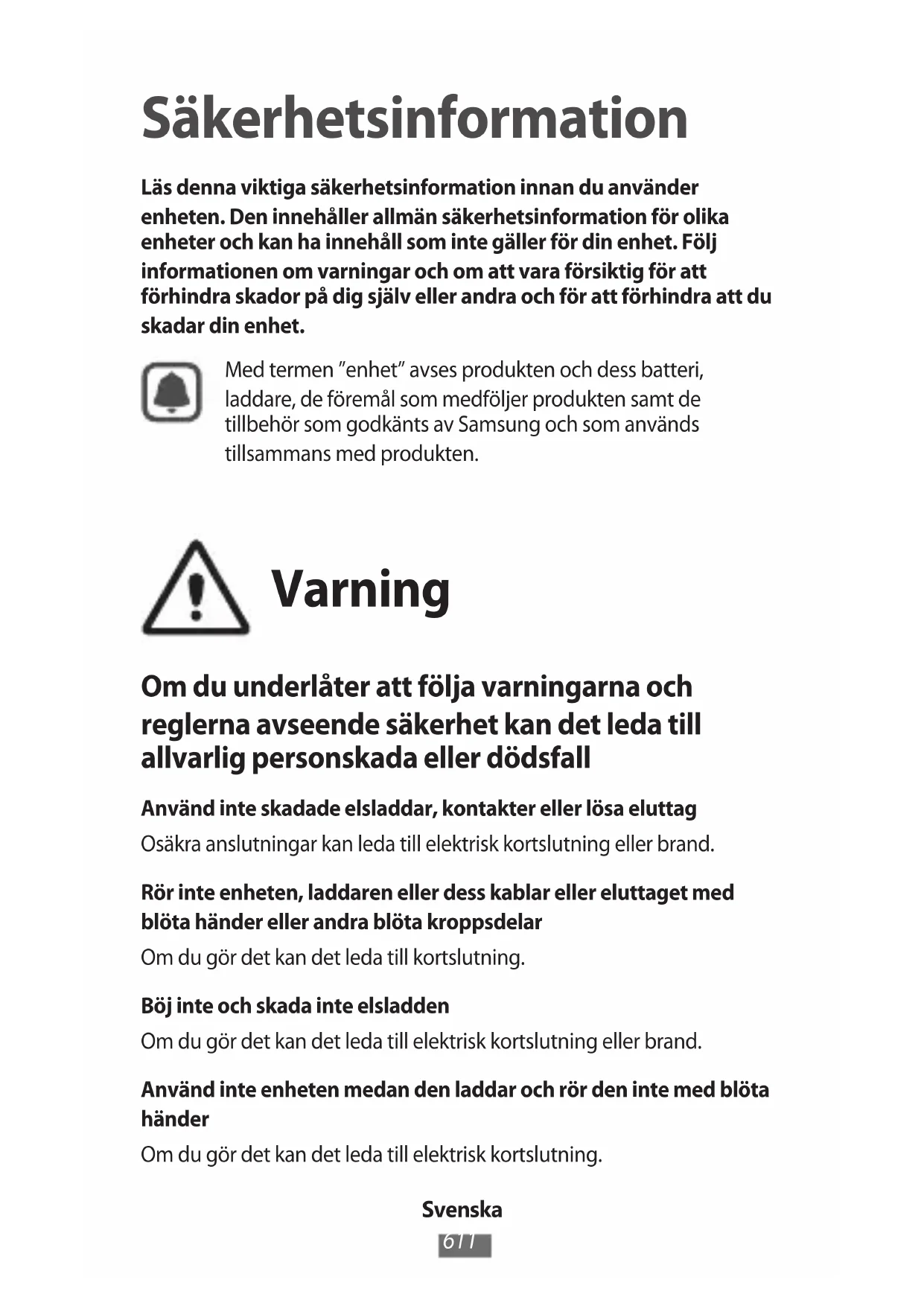 Säkerhetsinformation Läs denna viktiga säkerhetsinformation innan du använder enheten. Den innehåller allmän säkerhetsinformation för olika enheter och kan ha innehåll som inte gäller för din enhet. Följ informationen om varningar och om att vara försiktig för att förhindra skador på dig själv eller andra och för att förhindra att du skadar din enhet. Med termen ”enhet” avses produkten och dess batteri, laddare, de föremål som medföljer produkten samt de tillbehör som godkänts av Samsung och som används tillsammans med produkten. Varning Om du underlåter att följa varningarna och reglerna avseende säkerhet kan det leda till allvarlig personskada eller dödsfall Använd inte skadade elsladdar, kontakter eller lösa eluttag Osäkra anslutningar kan leda till elektrisk kortslutning eller brand. Rör inte enheten, laddaren eller dess kablar eller eluttaget med blöta händer eller andra blöta kroppsdelar Om du gör det kan det leda till kortslutning. Böj inte och skada inte elsladden Om du gör det kan det leda till elektrisk kortslutning eller brand. Använd inte enheten medan den laddar och rör den inte med blöta händer Om du gör det kan det leda till elektrisk kortslutning.Svenska