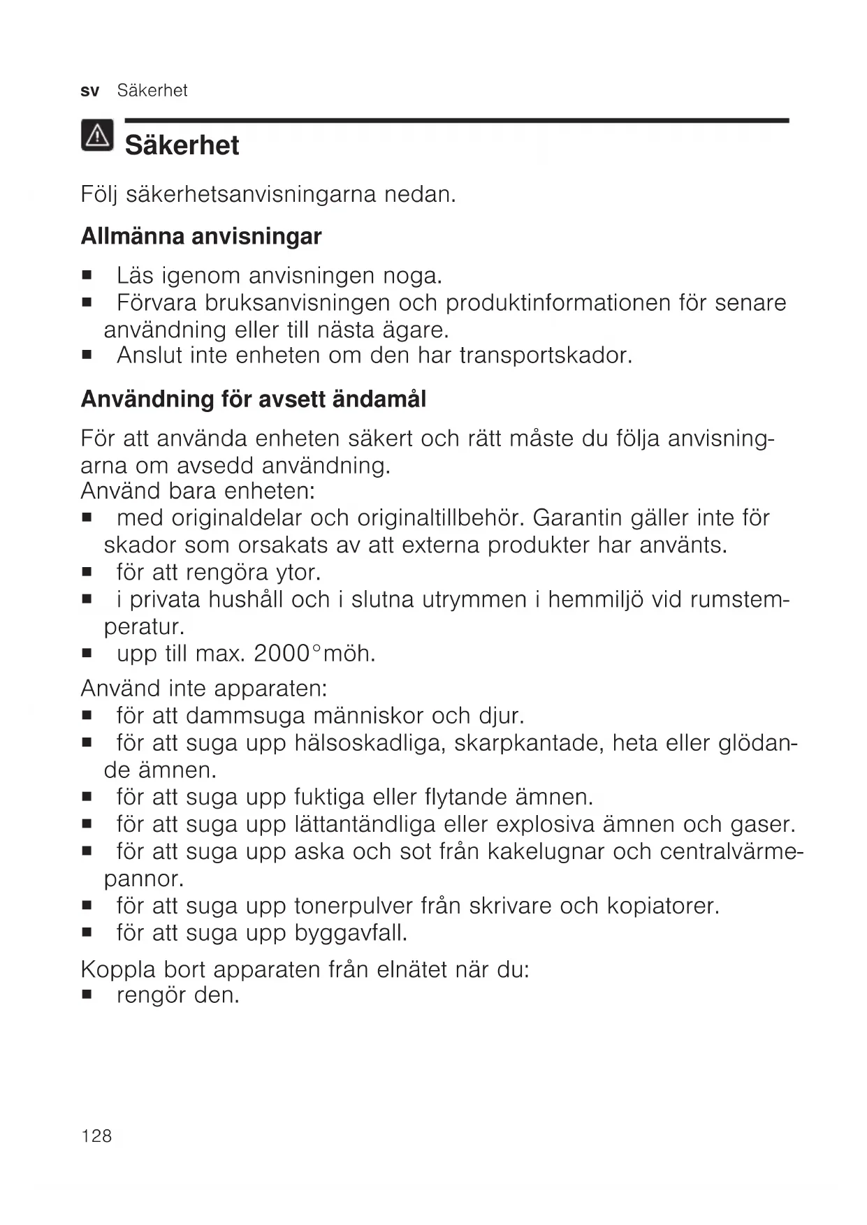 Säkerhet Följ säkerhetsanvisningarna nedan. Allmänna anvisningar ¡ Läs igenom anvisningen noga. ¡ Förvara bruksanvisningen och produktinformationen för senare användning eller till nästa ägare. ¡ Anslut inte enheten om den har transportskador. Användning för avsett ändamål För att använda enheten säkert och rätt måste du följa anvisning- arna om avsedd användning. Använd bara enheten: ¡ med originaldelar och originaltillbehör. Garantin gäller inte för skador som orsakats av att externa produkter har använts. ¡ för att rengöra ytor. ¡ i privata hushåll och i slutna utrymmen i hemmiljö vid rumstem- peratur. ¡ upp till max. 2000°möh. Använd inte apparaten: ¡ för att dammsuga människor och djur. ¡ för att suga upp hälsoskadliga, skarpkantade, heta eller glödan- de ämnen. ¡ för att suga upp fuktiga eller flytande ämnen. ¡ för att suga upp lättantändliga eller explosiva ämnen och gaser. ¡ för att suga upp aska och sot från kakelugnar och centralvärme- pannor. ¡ för att suga upp tonerpulver från skrivare och kopiatorer. ¡ för att suga upp byggavfall. Koppla bort apparaten från elnätet när du: ¡ rengör den.Säkerhet sv
