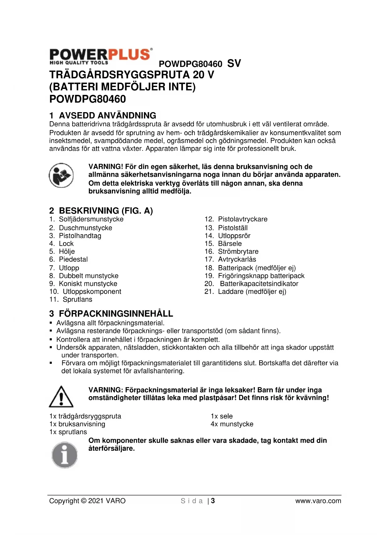 När utrustningen efter långvarigt bruk tjänat ut och behöver ersättas, får den inte slängas med hushållssoporna, utan ska deponeras på ett miljömässigt säkert sätt. Avfall härrörande från elektrisk utrustning får inte slängas med hushållssoporna. Lämna elektrisk och elektronisk utrustning på avsedda uppsamlingsplatser för återvinning. Kontakta lokala myndigheter eller din lokala återförsäljare för information om hur förbrukade produkter ska returneras.POWDPG80460 FI Copyright © 2021 VARO S i v u | 1 www.varo.com