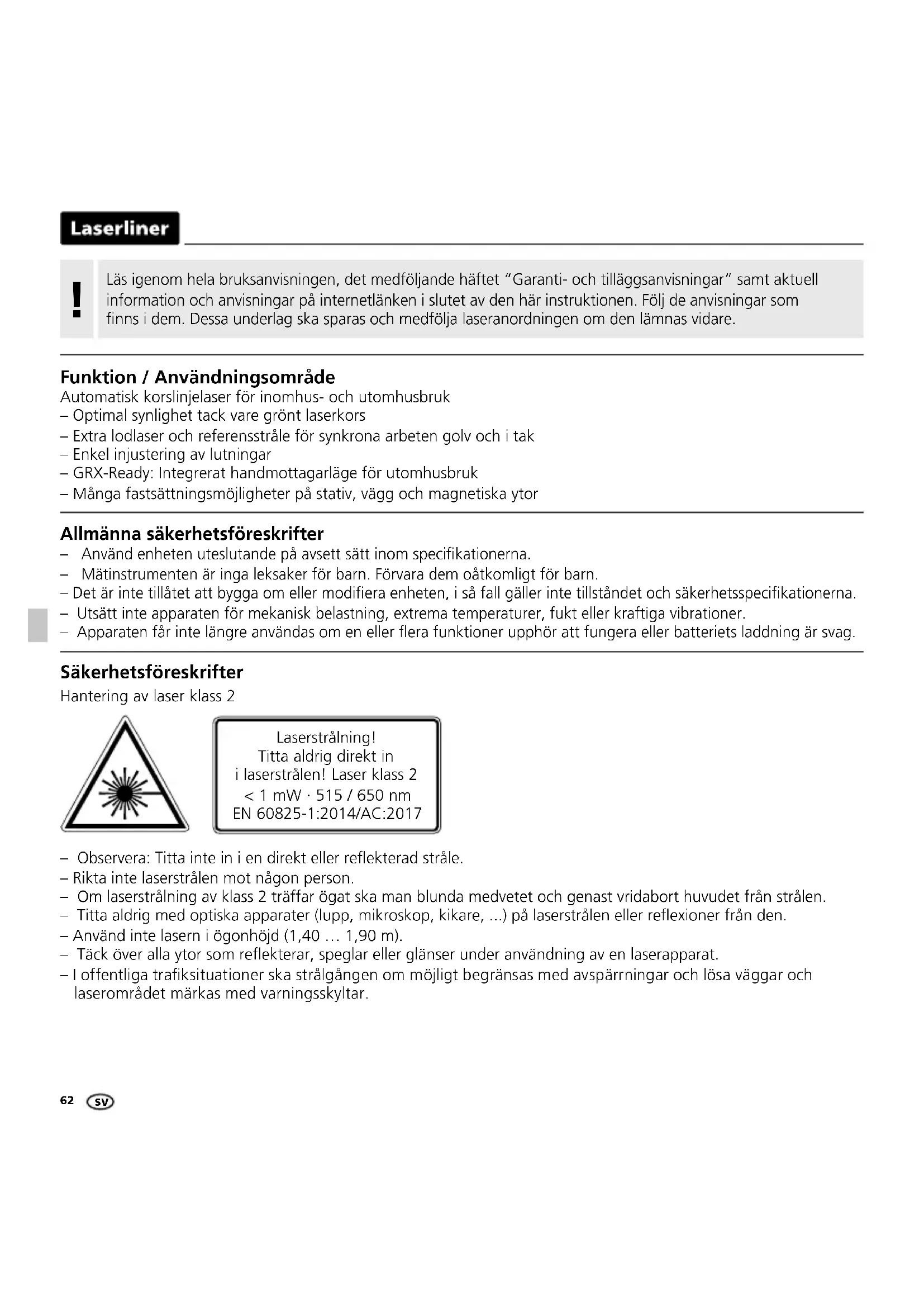 Allmänna säkerhetsföreskrifter – Använd enheten uteslutande på avsett sätt inom specikationerna. – Mätinstrumenten är inga leksaker för barn. Förvara dem oåtkomligt för barn. – Det är inte tillåtet att bygga om eller modiera enheten, i så fall gäller inte tillståndet och säkerhetsspecikationerna. – Utsätt inte apparaten för mekanisk belastning, extrema temperaturer, fukt eller kraftiga vibrationer. – Apparaten får inte längre användas om en eller era funktioner upphör att fungera eller batteriets laddning är svag. Säkerhetsföreskrifter Hantering av laser klass 2 – Observera: Titta inte in i en direkt eller reekterad stråle. – Rikta inte laserstrålen mot någon person. – Om laserstrålning av klass 2 träffar ögat ska man blunda medvetet och genast vridabort huvudet från strålen. – Titta aldrig med optiska apparater (lupp, mikroskop, kikare, ...) på laserstrålen eller reexioner från den. – Använd inte lasern i ögonhöjd (1,40 … 1,90 m). – Täck över alla ytor som reekterar, speglar eller glänser under användning av en laserapparat. – I offentliga traksituationer ska strålgången om möjligt begränsas med avspärrningar och lösa väggar och laserområdet märkas med varningsskyltar. Laserstrålning! Titta aldrig direkt in i laserstrålen! Laser klass 2 < 1 mW · 515 / 650 nm EN 60825-1:2014/AC:2017 Funktion / Användningsområde Automatisk korslinjelaser för inomhus- och utomhusbruk – Optimal synlighet tack vare grönt laserkors – Extra lodlaser och referensstråle för synkrona arbeten golv och i tak – Enkel injustering av lutningar – GRX-Ready: Integrerat handmottagarläge för utomhusbruk – Många fastsättningsmöjligheter på stativ, vägg och magnetiska ytor SVSuperCross-Laser 2GP