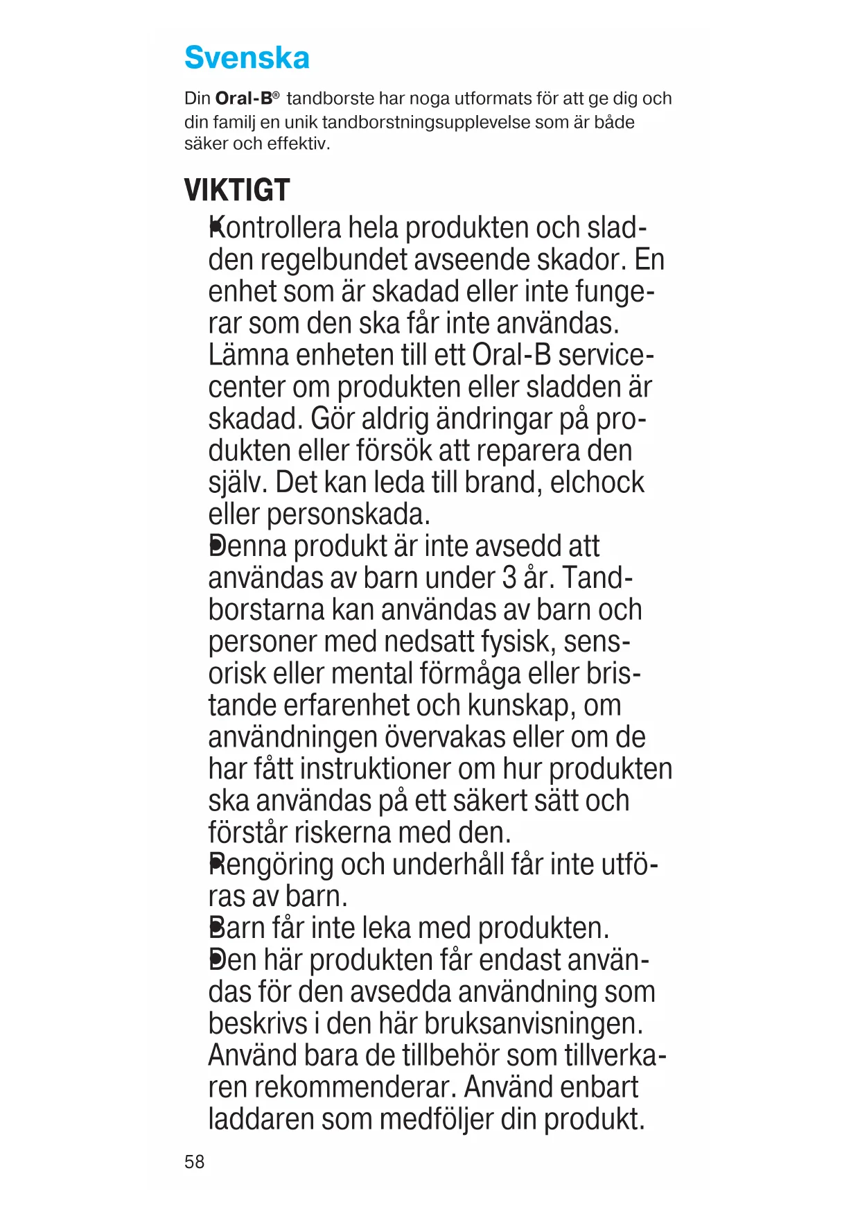 Denna produkt är inte avsedd att användas av barn under 3 år. Tand- borstarna kan användas av barn och personer med nedsatt fysisk, sens- orisk eller mental förmåga eller bris- tande erfarenhet och kunskap, om användningen övervakas eller om de har fått instruktioner om hur produkten ska användas på ett säkert sätt och förstår riskerna med den.