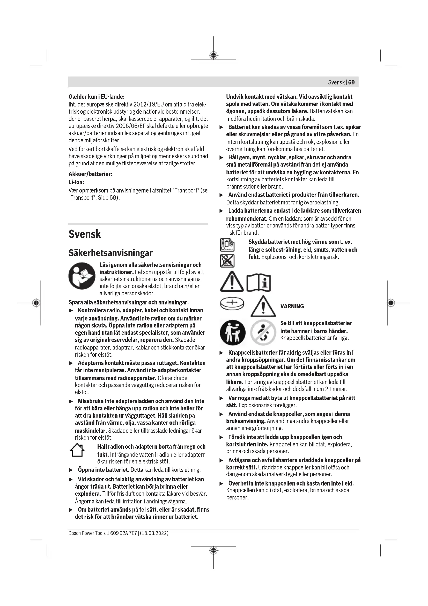 ställas in på ett lågt värde, innan en extern ljudkälla startas på ett medelhögt värde. För att stänga av ljudet kan du trycka kort på knappen Tyst(8). För att aktivera ljudet igen trycker du antingen kort på knappen Tyst eller vrider på-/av-knappen(2) medsols. Volymen kan ändras när som helst. Om menyfunktionen är aktiverad, återgår indikeringen till menyn efter några sekunder. Radion stängs av automatiskt efter 19minuter, under följande förutsättningar: – Radions volym är inställd till 0 – Radion är inställd på ljudlöst – Volymen på uppspelningsenheten (t.ex. smarttelefon) är inställd till 0. Välja ljudkälla För att välja en ljudkälla trycker du på knappen Source(7) tills displayen visar önskad intern eller extern ljudkälla: – DAB/DAB2: digital radio via DAB+ (GPB18V‑2SC) – FM/FM2: analog radio via UKV – AUX: extern ljudkälla (t.ex. smarttelefon) via 3,5mm- uttagetAUXIN(24) i anslutningsfacket(15), – : extern ljudkälla (t. ex. smarttelefon) med anslutning via Bluetooth®. Aktuell ljudkälla visas i indikeringen Ljudkälla(b) resp. Bluetooth®(a). Ljudkällorna DAB och DAB2 (GPB18V‑2SC) samt FM och FM2 skiljer sig inte i funktion, utan utgör bara extra kanalplatser. 1 609 92A 7E7 | (18.03.2022) Bosch Power ToolsSvensk | 73 Ställa in/spara DAB+-kanal (GPB18V‑2SC) För val av ljudkällan DAB+-kanal trycker du på knappen Source(7) tills indikeringen Ljudkälla(b) visar DAB eller DAB2. Efter en kort startprocedur spelas senast inställda radiokanal upp. Kanalens namn visas i den översta raden i multifunktionsindikeringen(k). I menyn kan du ställa in vilken ytterligare information som ska visas i den undre raden på multifunktionsindikeringen. – För att byta kanal vrider du knappen Source(7) tills önskad kanal visas i displayen. Tryck på knappen Source(7) för att bekräfta valet. Radion växlar till vald kanal. Som alternativ kan du trycka på knappen Nedåtsök(10) eller knappen Uppåtsök(9). Radion växlar till nästa tillgängliga kanal (i alfabetisk ordning stigande eller fallande). – För att spara en inställd kanal trycker du på kanalknappen(5) för önskad plats tills numret för önskad plats visas i indikeringen Minnesplats(c). Om de fyra minnesplatserna för ljudkällaDAB är upptagna, tryck på knappen Source(7) för att växla till ljudkällan DAB2, där ytterligare fyra minnesplatser finns tillgängliga. Observera att du måste ställa in önskad kanal på nytt efter ett byte för att kunna spara den. – För att spela upp en sparad kanal trycker du kort på en av kanalknapparna(5). Minnesplatsens nummer visas i indikeringen Minnesplats(c). Tryck eventuellt på knappen Source(7) för att växla mellan ljudkällorna DAB och DAB2 för att få tillgång till alla sparade kanaler. Observera: vid svag radiosignal visas<Weak Signal> i multifunktionsindikeringen(k). I detta fall kan du starta DAB+-kanalsöket manuellt. Antingen väljer du<Auto Scan> i menyn, eller så trycker du på knappen Nedåtsök(10) och knappen Uppåtsök(9) samtidigt. När sökningen har avslutats sparas fyra kanaler på kanalplats 1 till 4. Kanaler som redan sparats skrivs över. Om ingen DAB+-kanal kan hittas visas <No DAB Station– Please Auto Scan> i multifunktionsindikeringen(k). Ställa in/spara UKV-radiokanal För att välja ljudkällan UKV-kanal trycker du på knappen Source(7) tills indikeringen Ljudkälla(b) visar FM eller FM2. GPB18V‑2C: frekvensen för kanalen som spelas upp visas i indikeringen radiofrekvens(d). GPB18V‑2SC: frekvensen för den kanal som just nu spelas upp visas i den översta raden i multifunktionsindikeringen(k). I menyn kan du ställa in vilken ytterligare information som ska visas i den undre raden på multifunktionsindikeringen. Vid tillräckligt bra signal växlar radion automatiskt till stereomottagning, och på displayen visas indikeringen Stereomottagning(h). I menyfunktionen kan man växla till monomottagning. – För att ställa in en viss kanal vrider du på knappen Source(7) (TUNE) tills önskad frekvens resp. önskad kanal visas på displayen. – För att söka efter nästa kanal med hög signalstyrka trycker du kort på knappen Nedåtsök(10) eller knappen Uppåtsök(9). Nästa kanal som hittas visas på displayen och spelas upp. – För att söka efter alla kanaler med hög signalstyrka trycker du på knappen Nedåtsök(10) eller knappen Uppåtsök(9) i mer än en halv sekund. Varje kanal som hittas spelas upp i 5sekunder, därefter fortsätter sökningen till slutet av frekvensbandet. För att avbryta kanalsökningen, tryck kort på knappen Nedåtsök(10) eller knappen Uppåtsök(9). – För att spara en inställd kanal trycker du på kanalknappen(5) för önskad plats tills numret för önskad plats visas i indikeringen Minnesplats(c). Om de fyra minnesplatserna för ljudkällaFM är upptagna, tryck på knappen Source(7) för att växla till ljudkällanFM2, där ytterligare fyra minnesplatser finns tillgängliga. Observera att du måste ställa in önskad kanal på nytt efter ett byte för att kunna spara den. – För att automatiskt söka och spara kanalen med högst signalstyrka (AUTOSTORE) trycker du på knappen Nedåtsök(10) och knappen Uppåtsök(9) samtidigt. Radion kontrollerar alla mottagningsbara kanaler och sparar de fyra kanaler som har bäst signalstyrka på programplatserna 1 till 4. Observera att eventuella tidigare kanaler skrivs över. När sökningen har avslutats spelas den kanal upp som är sparad på kanalplats 1. – För att spela upp en sparad kanal trycker du kort på en av kanalknapparna(5). Minnesplatsens nummer visas i indikeringen Minnesplats(c). Tryck eventuellt på knappen Source(7) för att växla mellan ljudkällorna FM och FM2 för att få tillgång till alla sparade kanaler. Rikta upp stavantennen Radion levereras med monterad stavantenn(6). Vid användning i UKV-läge, vrid antennen i den riktning som ger bäst mottagning. Om det inte finns t