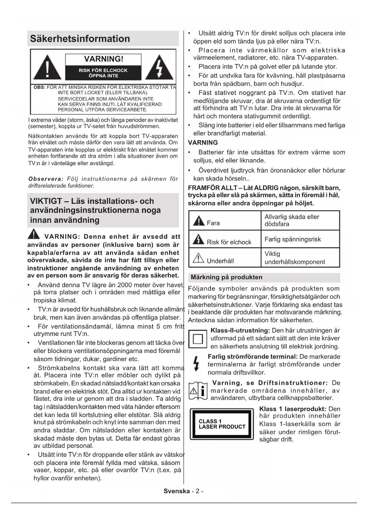 Klass 1 laserprodukt: Den här produkten innehåller Klass 1-laserkälla som är säker under rimligen förut- sägbar drift.Svenska - 3 - VARNING Svälj inte batterier, fara för kemiska brännskador. Denna produkt eller tillbehören som medföljer produkten kan innehålla ett mynt/knappcellsbatteri. Om knappcellsbatteriet sväljs kan det orsaka allvarliga inre brännskador på bara 2 timmar och kan leda till döden. Håll nya och använda batterier oåtkomliga för barn. Om batteriluckan inte går att stänga helt, sluta använda produkten och håll den borta ifrån barn. Om du tror att batterierna har svalts eller placerats på något sätt inne i kroppen ska du omgående söka läkarvård. – – – – – – – – – – – – TV:n kan falla och orsaka allvarlig personskada eller dödsfall. Många skador, speciellt på barn, kan undvikas genom att vidta enkla försiktighetsåtgärder, såsom;