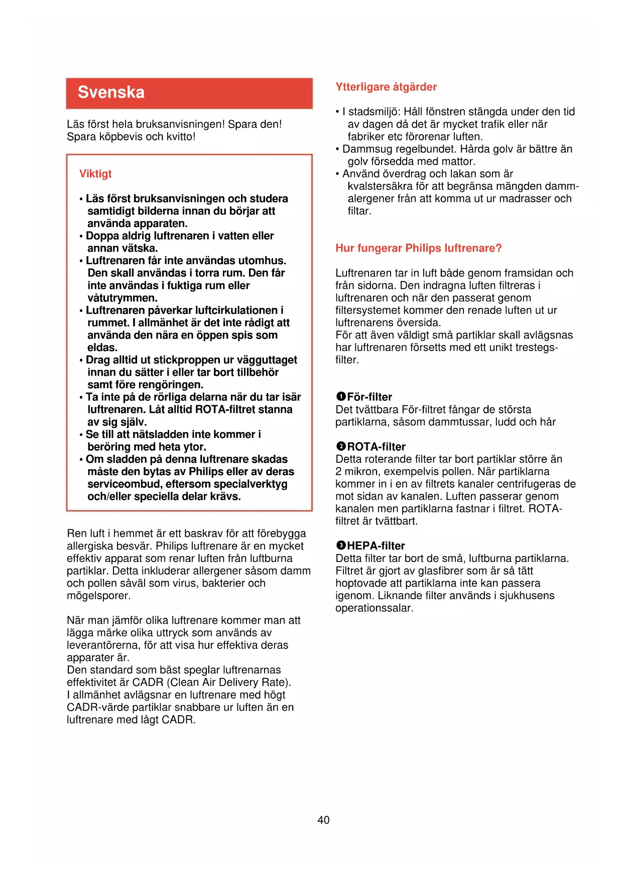 - Använd överdrag och lakan som är kvalstersäkra för att begränsa mängden damm- alergener från att komma ut ur madrasser och filtar. Hur fungerar Philips luftrenare? Luftrenaren tar in luft både genom framsidan och från sidorna. Den indragna luften filtreras i luftrenaren och när den passerat genom filtersystemet kommer den renade luften ut ur luftrenarens översida. För att även väldigt små partiklar skall avlägsnas har luftrenaren försetts med ett unikt trestegs- filter. 1 För-filter Det tvättbara För-filtret fångar de största partiklarna, såsom dammtussar, ludd och hår 2 ROTA-filter Detta roterande filter tar bort partiklar större än 2 mikron, exempelvis pollen. När partiklarna kommer in i en av filtrets kanaler centrifugeras de mot sidan av kanalen. Luften passerar genom kanalen men partiklarna fastnar i filtret. ROTA- filtret är tvättbart. 3 HEPA-filter Detta filter tar bort de små, luftburna partiklarna. Filtret är gjort av glasfibrer som är så tätt hoptovade att partiklarna inte kan passera igenom. Liknande filter används i sjukhusens operationssalar. Svenska Ren luft i hemmet är ett baskrav för att förebygga allergiska besvär. Philips luftrenare är en mycket effektiv apparat som renar luften från luftburna partiklar. Detta inkluderar allergener såsom damm och pollen såväl som virus, bakterier och mögelsporer. När man jämför olika luftrenare kommer man att lägga märke olika uttryck som används av leverantörerna, för att visa hur effektiva deras apparater är. Den standard som bäst speglar luftrenarnas effektivitet är CADR (Clean Air Delivery Rate). I allmänhet avlägsnar en luftrenare med högt CADR-värde partiklar snabbare ur luften än en luftrenare med lågt CADR. Läs först hela bruksanvisningen! Spara den! Spara köpbevis och kvitto!41 Beskrivning fig 1