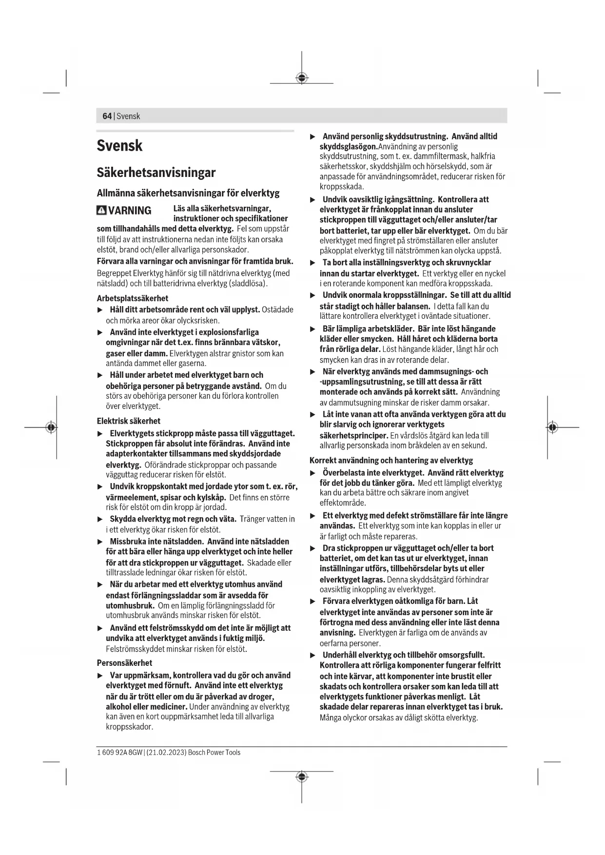 (2608000766) – För universell användning på jämna och välvda ytor – Satsen består av en mjuk sliprondell och en dyna (2608000765). Sliprondellen får endast användas tillsammans med dynan. Sliprondell medelhård (2608000764) – Hög avverkning, perfekt för hård puts och borttagning av gammal väggfärg – För användning på jämna ytor – Optimalt dammutsug underlättar arbetet vid användning av en dammsugare. A) Standardleverans Byta ut dynan (sebildA) Vid användning av den mjuka sliprondellen (standard) måste alltid en dyna(14) användas. För att ta av dynan(14) lyfter du den i sidan och drar av den från sliprondellen(16). Ta bort smuts och damm från sliprondellen (16), t. ex. med en pensel, innan du sätter på en ny dyna. Sliprondellens (16) yta består av ett kardborrfäste så att dynan kan fästas enkelt och snabbt. Tryck dynan (14) fast på undersidan av sliprondellen (16). För optimalt dammutsug, se till att utstansningarna i dynan(14) stämmer överens med hålen i sliprondellen(16). Byta sliprondell (sebildB) Anmärkning: Byt omedelbart ut skadade sliptallrikar (16). Dra av slippappret(13) och dynan(14). Skruva ut skruven (15) helt och hållet och ta av sliprondellen (16). Sätt på den nya sliprondellen (16) och dra åt skruven igen. Anmärkning: Kontrollera vid påsättning av sliptallriken att medbringarens kuggning griper tag i sliptallrikens urtagningar. 1 609 92A 8GW | (21.02.2023) Bosch Power ToolsSvensk | 67 Anmärkning: En skadad sliptallrik får bara bytas av en auktoriserad kundtjänst för Bosch elverktyg. Sätta i/ta ut förlängningsrör (sebildC−D) Använd endast förlängningsrör(9) vid behov: vid arbete utan förlängningsrör minskar den kraften som behövs för slipning. Observera: max 2förlängningsrör får användas. Lossa anslutningen mellan sliphuvud/grepp/ förlängningsrör (se bildC): – ➊ Öppna spännspaken (8). – ➋ Öppna låshaken (7). – ➌ Dra isär delarna. Sätta ihop sliphuvud/grepp/förlängningsrör (se bildD): – ➍ Skjut in sliphuvud,(10), grepp(6) och förlängningsrör(9) i varandra enligt önskemål. – ➎ Stäng låshaken(7). – ➏ Tryck på spännspaken(8) så att den står i rät vinkel mot sliphuvudet(10), greppet(6) och förlängningsröret(9). – ➐ Dra åt excenterskruven (20). – ➑ Stäng spännspaken(8). Kontrollera alltid om alla anslutningsdelar är säkrade och sitter stadigt med låshaken (7) och spännspaken (8). Damm-/spånutsugning Damm från olika material kan vara hälsovådligt. Beröring eller inandning av dammet kan orsaka allergiska reaktioner och/eller andningsbesvär hos användaren eller personer som uppehåller sig i närheten. Vissa typer av damm är cancerframkallande. – Använd om möjligt en för materialet lämplig dammutsugning. – Se till att arbetsplatsen är väl ventilerad. – Bär alltid ett andningsskydd i filterklass P2. Ansluta dammutsug (sebildE) Välj en av de båda anslutningsmöjligheterna beroende på vilken dammsugare som används: – Sätt in utsugsslangen (21) i utblåsningsstutsen(5) på greppet(6) och låt den klicka fast. Anslut utsugsslangen(21) till en dammsugare. – Sätt in adaptern(22) i utblåsningsstutsen(5) och låt den klicka fast. Sätt in munstycket(23) på dammsugaren i adaptern(22). Sugen måste vara lämplig för det material som ska bearbetas. Använd en specialsug för att suga hälsovådligt och cancerframkallande eller torrt damm. Använd utsuget GAS35L/MAFC eller GAS55MAFC för stora ytor, eftersom de garanterar kontinuerlig sugeffekt. Vid arbeten på lodräta ytor håller du elverktyget så att utsugsslangen pekar nedåt. Montera/demontera slang-/kabelklämma (sebildF) Fäll slang-/kabelklämman (24) över utsugsslangen (21). Sätt in elkabeln i slang-/kabelklämmans spår. Vid demontering, dra av slang-/kabelklämman (24) från utsugsslangen (21) och dra ut elkabeln ur slang-/ kabelklämman. Drift Driftstart u Beakta nätspänningen! Kontrollera att strömkällans spänning överensstämmer med uppgifterna på elverktygets typskylt. Elverktyg märkta med 230V kan även anslutas till 220V. Förval av varvtal Med reglaget för varvtalsförval(2) kan du välja det varvtal du behöver, även under drift. Högre siffra innebär högre varvtal, lägre siffra ett lägre varvtal. Konstantelektroniken håller varvtalet på tomgång och belastningen nästan konstant och säkerställer en jämn arbetsprestanda. Den elektroniska mjukstarten begränsar vridmomentet vid påslagning och ökar motorns livslängd. In- och urkoppling u Se till att du kan manövrera på-/av-strömbrytaren utan att släppa handtaget. För att starta elverktyget, skjut på-/avknappen (3) framåt så att ”I” visas på knappen. För att stänga av elverktyget, skjut på-/avknappen (3) bakåt så att ”0” visas på knappen. Användningsöversikt Spackel-/ gipshårdhet Vägg/ tak Inre/yttre luftström Sugeffekt Varvtalssteg Kornstorlek slippapper Mycket mjuk/mjuk Vägg/tak ➀ 6 2–4 Från P180 Medelhård Vägg ➀ 6 4–6 Från P120 Bosch Power Tools 1 609 92A 8GW | (21.02.2023)68 | Svensk Spackel-/ gipshårdhet Vägg/ tak Inre/yttre luftström Sugeffekt Varvtalssteg Kornstorlek slippapper Tak ➂ 1–5 (optimal: 3) Mycket hård Vägg/tak ➀ vid ojämn yta 6 4–6 Från P100 ➂ vid jämn yta 1–3 Arbetsanvisningar u Dra stickproppen ur nätuttaget innan arbeten utförs på elverktyget. u Vänta tills elverktyget stannat helt innan du lägger bort det. u Lägg inte elverktyget på sidan. Sliprondellen kan bli permanent missformad. u Elverktyget är inte avsett för stationär drift. Det får t.ex. inte skruvas fast i ett skruvstycke eller fästas i en arbetsbänk. Slipa ytor Sätt på elverktyget, placera det med hela slipytan på det underlag som skall bearbetas och förflytta det med måttligt tryck över arbetsstycket. Avverkningseffekten och slipbilden är i hög grad beroende av valt slippapper, hastighet och anliggningstryck. Endast f