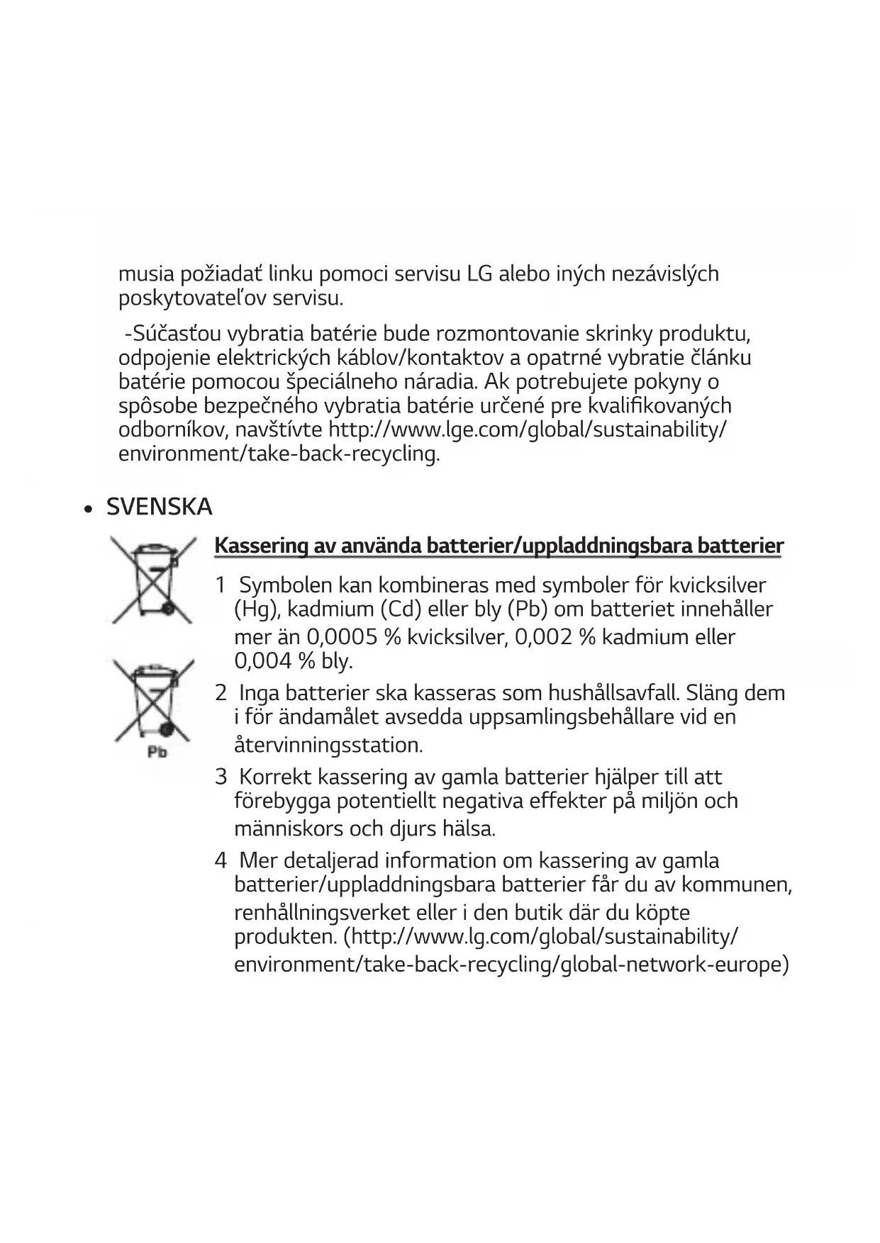 SVENSKA Kassering av använda batterier/uppladdningsbara batterier 1 Symbolen kan kombineras med symboler för kvicksilver (Hg), kadmium (Cd) eller bly (Pb) om batteriet innehåller mer än 0,0005 % kvicksilver, 0,002 % kadmium eller 0,004 % bly. 2 Inga batterier ska kasseras som hushållsavfall. Släng dem i för ändamålet avsedda uppsamlingsbehållare vid en återvinningsstation. 3 Korrekt kassering av gamla batterier hjälper till att förebygga potentiellt negativa effekter på miljön och människors och djurs hälsa. 4 Mer detaljerad information om kassering av gamla batterier/uppladdningsbara batterier får du av kommunen, renhållningsverket eller i den butik där du köpte produkten. (http://www.lg.com/global/sustainability/ environment/take-back-recycling/global-network-europe)Kassering av förbrukade batterier och ackumulatorer (Endast produkt med inbyggt batteri) -Om den här produkten innehåller ett batteri som sitter inbyggt i produkten och inte enkelt kan tas bort av användarna rekommenderar LG att endast behöriga personer tar ur batteriet, antingen för byte eller återvinning i slutet av produktens livslängd. För att förhindra skada på produkten och av säkerhetsskäl får användarna inte försöka ta ur batteriet och ska kontakta LG Service Helpline, eller en annan oberoende tjänsteleverantör för att få hjälp. -Borttagning av batteriet inkluderar demontering av produktens kåpa, frånkoppling av elektriska kablar/kontakter och försiktigt uttag av batteriet med specialverktyg. Vid behov av instruktioner från behöriga fackmän kring hur batteriet avlägsnas på ett säkert sätt, besök sidan http://www.lge.com/global/sustainability/environment/take-back-recycling.