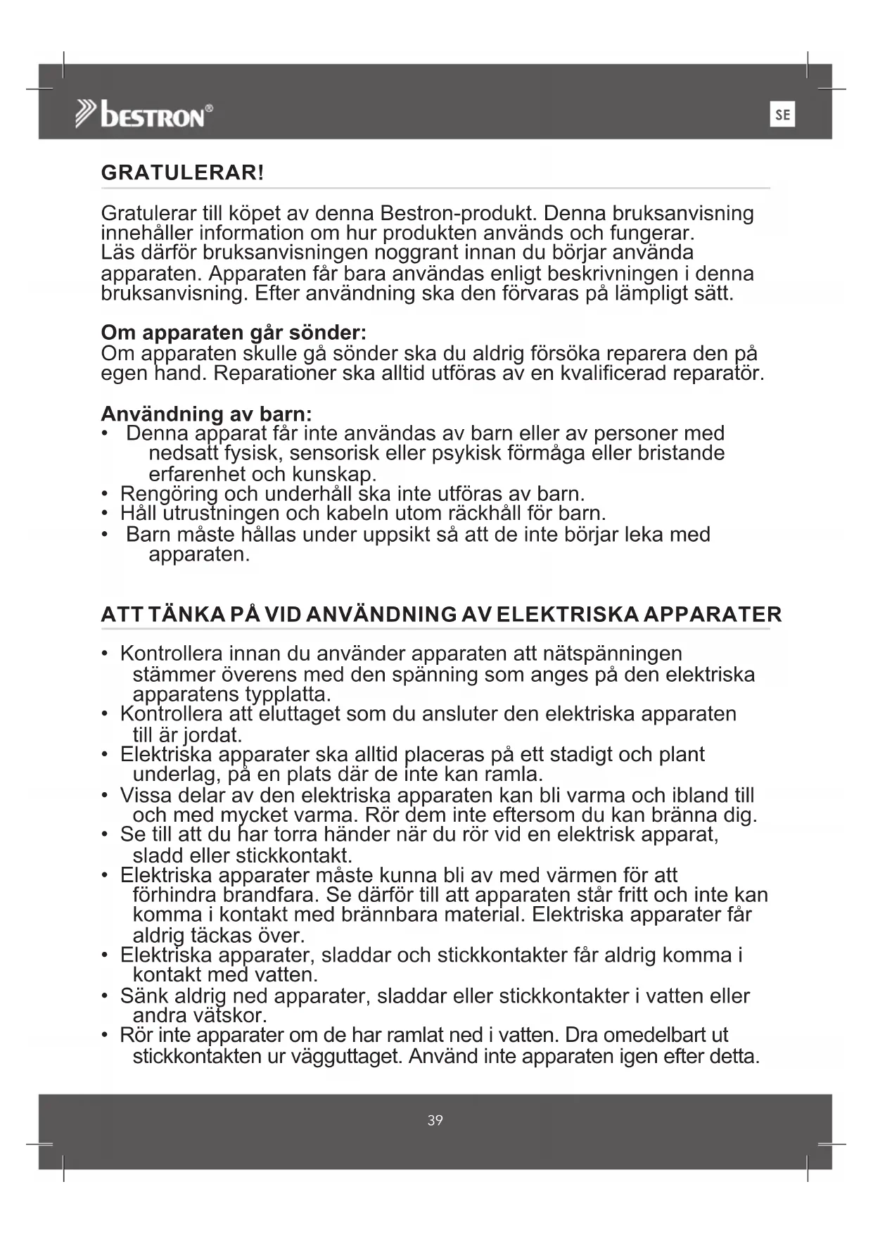 GRATULERAR! Gratulerar till köpet av denna Bestron-produkt. Denna bruksanvisning innehåller information om hur produkten används och fungerar. Läs därför bruksanvisningen noggrant innan du börjar använda apparaten. Apparaten får bara användas enligt beskrivningen i denna bruksanvisning. Efter användning ska den förvaras på lämpligt sätt. Om apparaten går sönder: Om apparaten skulle gå sönder ska du aldrig försöka reparera den på egen hand. Reparationer ska alltid utföras av en kvalificerad reparatör. Användning av barn: