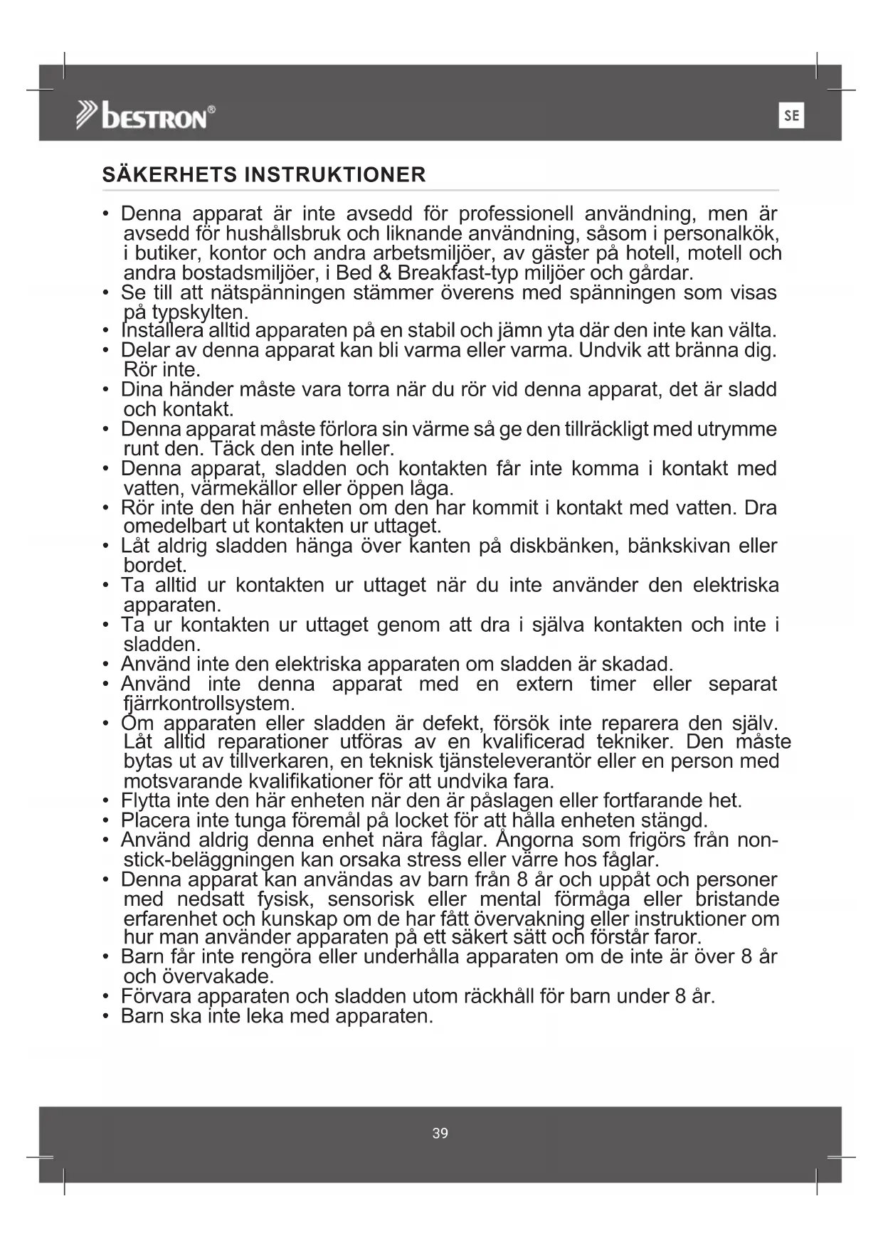- Din kommun kan berätta var du hittar den anvisade avfallsuppsamlingsplatsen i ditt område. SERVICE I den osannolika händelsen av ett fel, vänligen kontakta Bestron kundtjänst: www.bestron.com/service Tekniska specifikationer Modell ARG150BW Elnät 220-240V~ Frekvens (Hz) 50/60 Säkerhetsklass 1 Effekt (Watt) 350 Brus (dB(A)) - Max. Kapacitet - Maximal kontinuerlig drifttid (KB) - Mått (L x B x H) (cm) 31,5x10,5x10,8 Kabellängd (cm) 82 VISSA DELAR AV APPARATEN KAN BLI VARMA. RÖR INTE DESSA DELAR FÖR ATT FÖRHINDRA ATT BRÄNDA DIG SJÄLV.SE