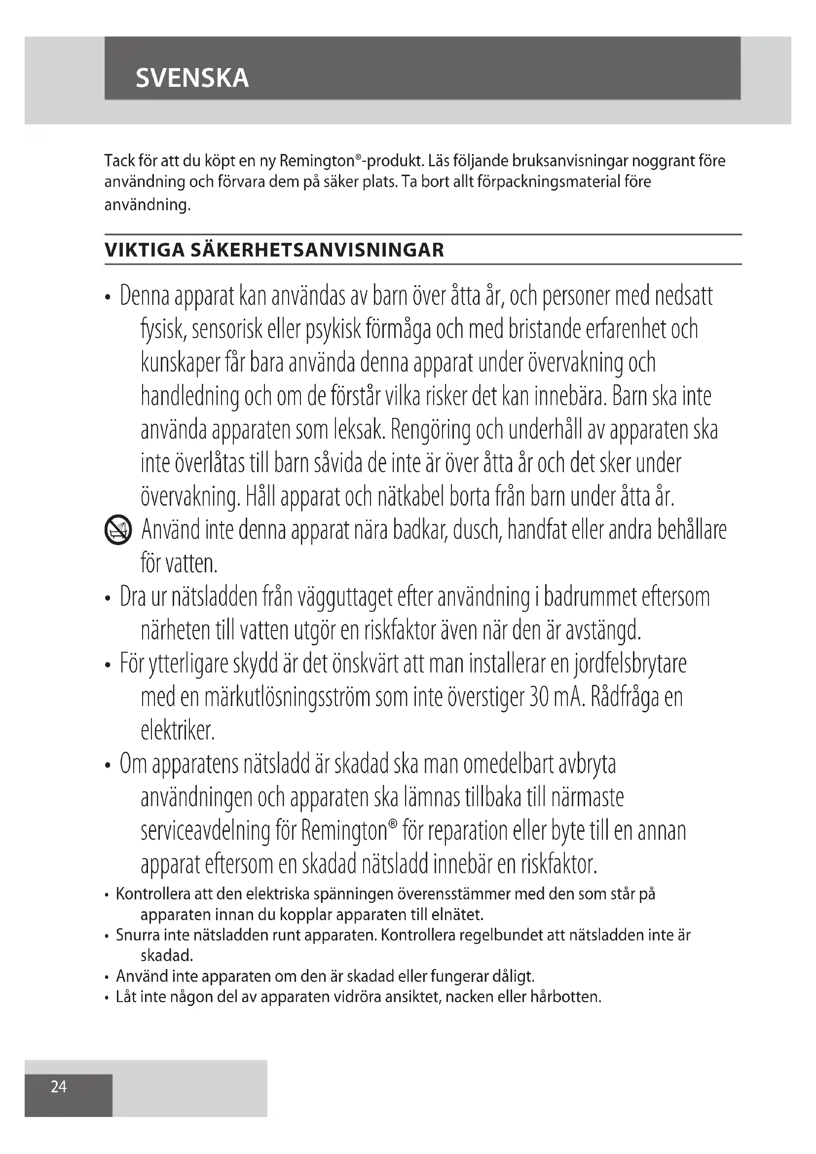AE24 SVENSKA Tack för att du köpt en ny Remington®-produkt. Läs följande bruksanvisningar noggrant före användning och förvara dem på säker plats. Ta bort allt förpackningsmaterial före användning.