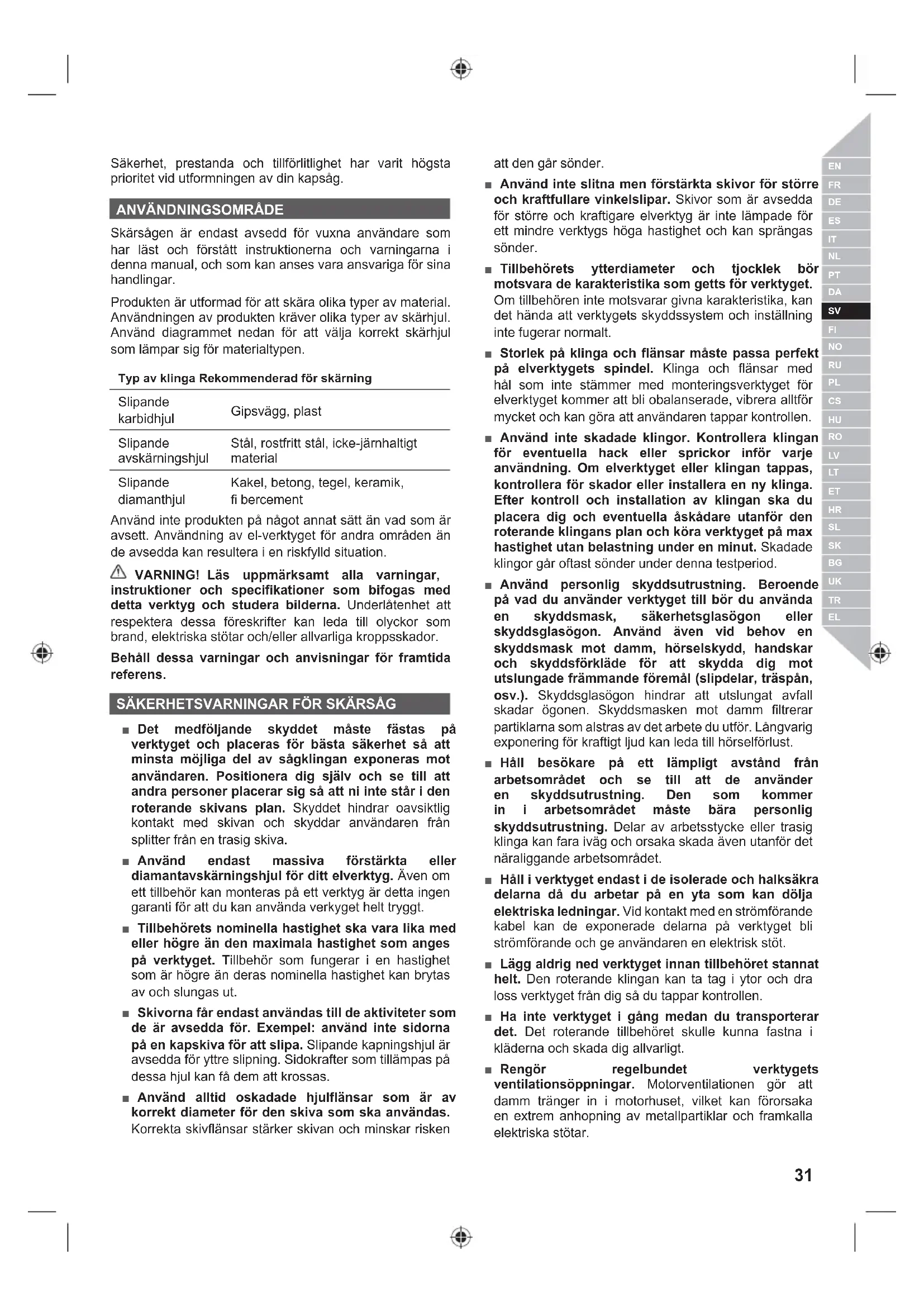 Skärsågen är endast avsedd för vuxna användare som har läst och förstått instruktionerna och varningarna i denna manual, och som kan anses vara ansvariga för sina handlingar. Produkten är utformad för att skära olika typer av material. Användningen av produkten kräver olika typer av skärhjul. Använd diagrammet nedan för att välja korrekt skärhjul som lämpar sig för materialtypen. Typ av klinga Rekommenderad för skärning Slipande karbidhjul Gipsvägg, plast Slipande avskärningshjul Stål, rostfritt stål, icke-järnhaltigt material Slipande diamanthjul Kakel, betong, tegel, keramik, fi bercement Använd inte produkten på något annat sätt än vad som är avsett. Användning av el-verktyget för andra områden än de avsedda kan resultera i en riskfylld situation. VARNING! Läs uppmärksamt alla varningar, instruktioner och specifikationer som bifogas med detta verktyg och studera bilderna. Underlåtenhet att respektera dessa föreskrifter kan leda till olyckor som brand, elektriska stötar och/eller allvarliga kroppsskador. Behåll dessa varningar och anvisningar för framtida referens. SÄKERHETSVARNINGAR FÖR SKÄRSÅG ■ Det medföljande skyddet måste fästas på verktyget och placeras för bästa säkerhet så att minsta möjliga del av sågklingan exponeras mot användaren. Positionera dig själv och se till att andra personer placerar sig så att ni inte står i den roterande skivans plan. Skyddet hindrar oavsiktlig kontakt med skivan och skyddar användaren från splitter från en trasig skiva. ■ Använd endast massiva förstärkta eller diamantavskärningshjul för ditt elverktyg. Även om ett tillbehör kan monteras på ett verktyg är detta ingen garanti för att du kan använda verkyget helt tryggt. ■ Tillbehörets nominella hastighet ska vara lika med eller högre än den maximala hastighet som anges på verktyget. Tillbehör som fungerar i en hastighet som är högre än deras nominella hastighet kan brytas av och slungas ut. ■ Skivorna får endast användas till de aktiviteter som de är avsedda för. Exempel: använd inte sidorna på en kapskiva för att slipa. Slipande kapningshjul är avsedda för yttre slipning. Sidokrafter som tillämpas på dessa hjul kan få dem att krossas. ■ Använd alltid oskadade hjulflänsar som är av korrekt diameter för den skiva som ska användas. Korrekta skivflänsar stärker skivan och minskar risken att den går sönder. ■ Använd inte slitna men förstärkta skivor för större och kraftfullare vinkelslipar. Skivor som är avsedda för större och kraftigare elverktyg är inte lämpade för ett mindre verktygs höga hastighet och kan sprängas sönder. ■ Tillbehörets ytterdiameter och tjocklek bör motsvara de karakteristika som getts för verktyget. Om tillbehören inte motsvarar givna karakteristika, kan det hända att verktygets skyddssystem och inställning inte fugerar normalt. ■ Storlek på klinga och flänsar måste passa perfekt på elverktygets spindel. Klinga och flänsar med hål som inte stämmer med monteringsverktyget för elverktyget kommer att bli obalanserade, vibrera alltför mycket och kan göra att användaren tappar kontrollen. ■ Använd inte skadade klingor. Kontrollera klingan för eventuella hack eller sprickor inför varje användning. Om elverktyget eller klingan tappas, kontrollera för skador eller installera en ny klinga. Efter kontroll och installation av klingan ska du placera dig och eventuella åskådare utanför den roterande klingans plan och köra verktyget på max hastighet utan belastning under en minut. Skadade klingor går oftast sönder under denna testperiod. ■ Använd personlig skyddsutrustning. Beroende på vad du använder verktyget till bör du använda en skyddsmask, säkerhetsglasögon eller skyddsglasögon. Använd även vid behov en skyddsmask mot damm, hörselskydd, handskar och skyddsförkläde för att skydda dig mot utslungade främmande föremål (slipdelar, träspån, osv.). Skyddsglasögon hindrar att utslungat avfall skadar ögonen. Skyddsmasken mot damm filtrerar partiklarna som alstras av det arbete du utför. Långvarig exponering för kraftigt ljud kan leda till hörselförlust. ■ Håll besökare på ett lämpligt avstånd från arbetsområdet och se till att de använder en skyddsutrustning. Den som kommer in i arbetsområdet måste bära personlig skyddsutrustning. Delar av arbetsstycke eller trasig klinga kan fara iväg och orsaka skada även utanför det näraliggande arbetsområdet. ■ Håll i verktyget endast i de isolerade och halksäkra delarna då du arbetar på en yta som kan dölja elektriska ledningar. Vid kontakt med en strömförande kabel kan de exponerade delarna på verktyget bli strömförande och ge användaren en elektrisk stöt. ■ Lägg aldrig ned verktyget innan tillbehöret stannat helt. Den roterande klingan kan ta tag i ytor och dra loss verktyget från dig så du tappar kontrollen. ■ Ha inte verktyget i gång medan du transporterar det. Det roterande tillbehöret skulle kunna fastna i kläderna och skada dig allvarligt. ■ Rengör regelbundet verktygets ventilationsöppningar. Motorventilationen gör att damm tränger in i motorhuset, vilket kan förorsaka en extrem anhopning av metallpartiklar och framkalla elektriska stötar.32 | Svenska ■ Använd inte verktyget i närheten av lättantändliga produkter. Gnistor kan antända dem. Återkast och relaterade varningar Kickback är en plötslig reaktion på en klämd eller satt roterande klinga. Klämning eller sättning ger snabbt stopp av den roterande klingan vilket ger att elverktyget inte kan kontrolleras och verktyget slungas iväg i den motsatta riktningen mot klingans rotation. Om till exempel en slipskiva kläms ihop eller vrids inne i arbetsstycket, kan eggen på skivan tryckas in i arbetsstyckets yta, vilket gör att skivan snabbt går ut ur arbetsstycket och slungas mot användaren. Hjulet kan antingen hoppa mot eller bort från operat
