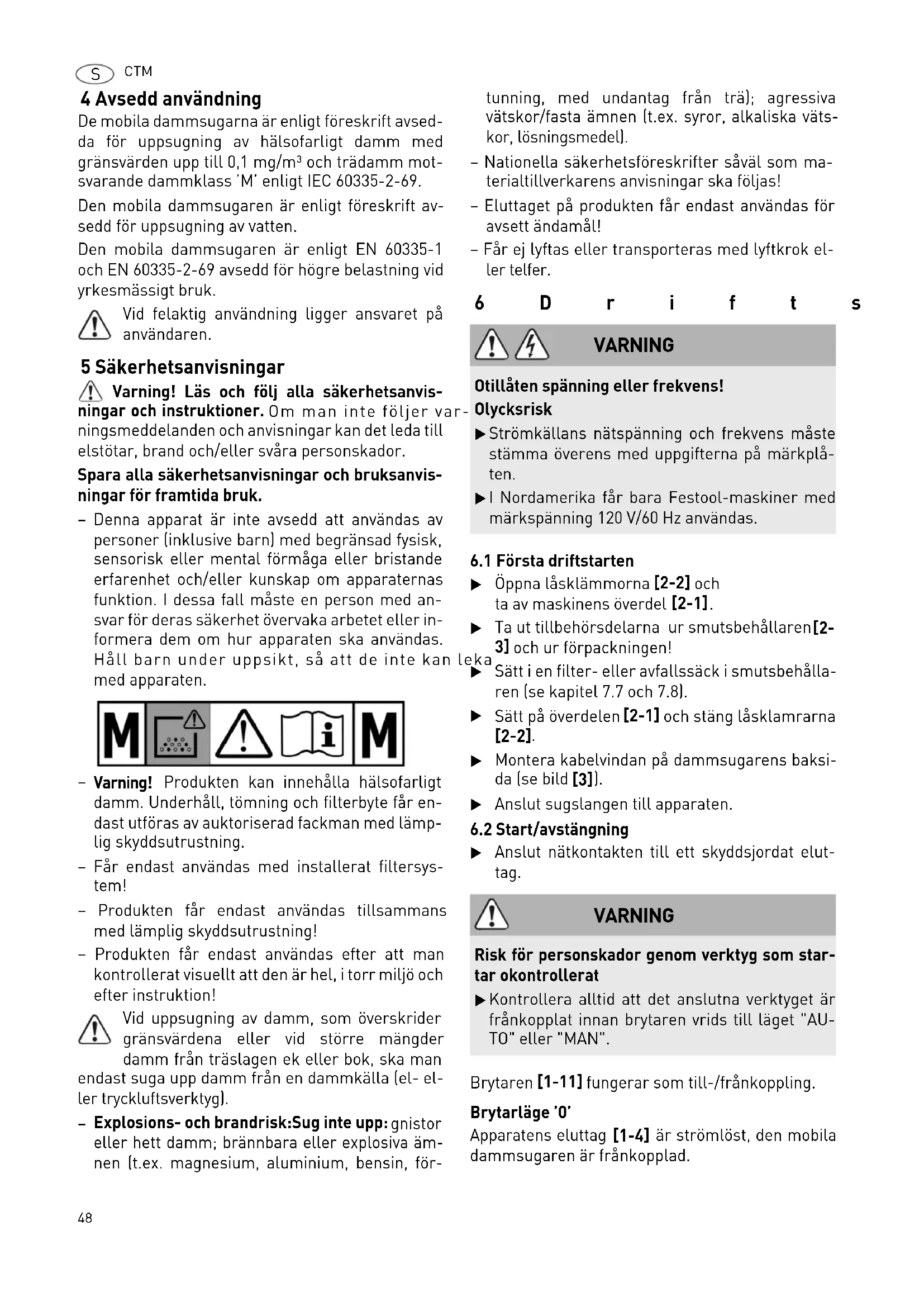 Varning! Produkten kan innehålla hälsofarligt damm. Underhåll, tömning och filterbyte får en- dast utföras av auktoriserad fackman med lämp- lig skyddsutrustning. – Får endast användas med installerat filtersys- tem! – Produkten får endast användas tillsammans med lämplig skyddsutrustning! – Produkten får endast användas efter att man kontrollerat visuellt att den är hel, i torr miljö och efter instruktion! Vid uppsugning av damm, som överskrider gränsvärdena eller vid större mängder damm från träslagen ek eller bok, ska man endast suga upp damm från en dammkälla (el- el- ler tryckluftsverktyg).