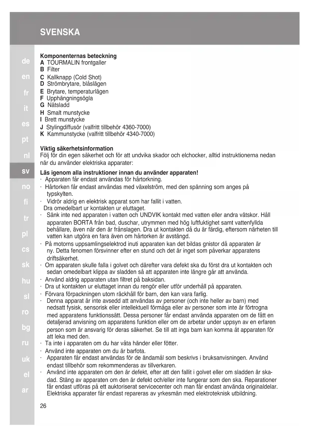 Komponenternas beteckning A TOURMALIN frontgaller B Filter C Kallknapp (Cold Shot) D Strömbrytare, blåslägen E Brytare, temperaturlägen F Upphängningsögla G Nätsladd H Smalt munstycke I Brett munstycke J Stylingdiffusör (valfritt tillbehör 4360-7000) K Kammunstycke (valfritt tillbehör 4340-7000) Viktig säkerhetsinformation Följ för din egen säkerhet och för att undvika skador och elchocker, alltid instruktionerna nedan när du använder elektriska apparater: Läs igenom alla instruktioner innan du använder apparaten!