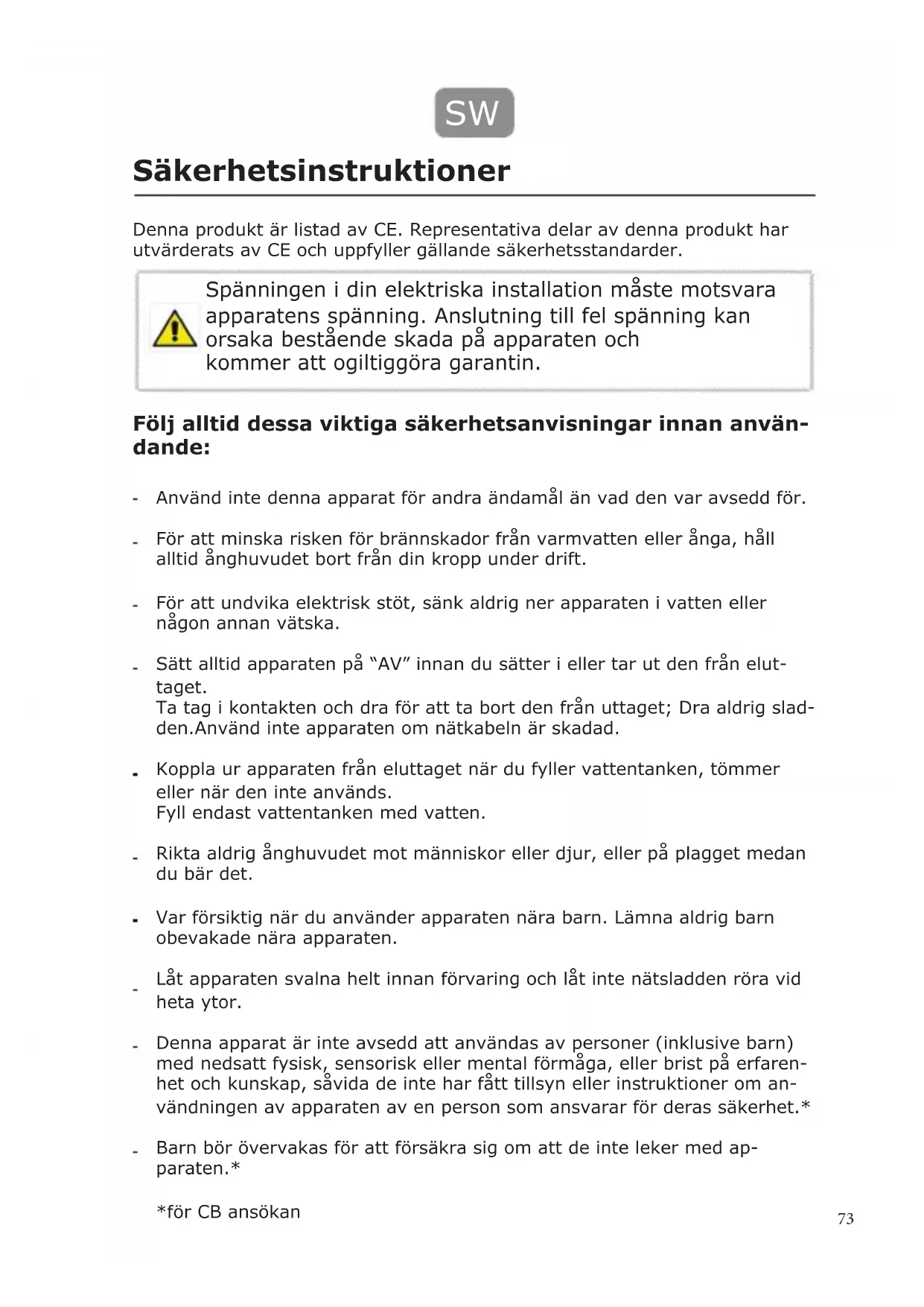 Säkerhetsinstruktioner Följ alltid dessa viktiga säkerhetsanvisningar innan använ- dande: Denna produkt är listad av CE. Representativa delar av denna produkt har utvärderats av CE och uppfyller gällande säkerhetsstandarder. Använd inte denna apparat för andra ändamål än vad den var avsedd för. För att minska risken för brännskador från varmvatten eller ånga, håll alltid ånghuvudet bort från din kropp under drift. För att undvika elektrisk stöt, sänk aldrig ner apparaten i vatten eller någon annan vätska. Sätt alltid apparaten på “AV” innan du sätter i eller tar ut den från elut- taget. Ta tag i kontakten och dra för att ta bort den från uttaget; Dra aldrig slad- den.Använd inte apparaten om nätkabeln är skadad. Koppla ur apparaten från eluttaget när du fyller vattentanken, tömmer eller när den inte används. Fyll endast vattentanken med vatten. Rikta aldrig ånghuvudet mot människor eller djur, eller på plagget medan du bär det. Var försiktig när du använder apparaten nära barn. Lämna aldrig barn obevakade nära apparaten. Låt apparaten svalna helt innan förvaring och låt inte nätsladden röra vid heta ytor. Denna apparat är inte avsedd att användas av personer (inklusive barn) med nedsatt fysisk, sensorisk eller mental förmåga, eller brist på erfaren- het och kunskap, såvida de inte har fått tillsyn eller instruktioner om an- vändningen av apparaten av en person som ansvarar för deras säkerhet.* Barn bör övervakas för att försäkra sig om att de inte leker med ap- paraten.* *för CB ansökan Spänningen i din elektriska installation måste motsvara apparatens spänning. Anslutning till fel spänning kan orsaka bestående skada på apparaten och kommer att ogiltiggöra garantin.74 Denna apparat kan användas av barn från 14 år och äldre och personer med nedsatt fysisk, sensorisk eller mental för- måga eller brist på erfarenhet och kun- skap om de har fått tillsyn eller instruk- tioner om användningen av apparaten på ett säkert sätt och förstår faror som är inblandade. Barn får inte leka med apparaten. Rengöring och underhåll av användaren ska inte göras av barn utan tillsyn. För optimal användning av apparaten, se “Underhåll” och “påfyllning” vid snabbstart. Om nätkabeln är skadad måste den bytas ut av tillverkaren, dess servicetekniker eller liknande kvalicerade personer för att undvika fara. Försiktighet bör vidtas vid användning av apparaten på grund av ångutsläpp. Koppla ur apparaten från eluttaget när du fyller vattentanken, rengör, tömmer den eller när den inte används. SW75 Använd inte apparaten om den har tappats eller skadats. För att undvika risk för skada, brand eller elektrisk stöt, försök inte de- montera eller reparera apparaten. Ta den till ett kvalicerat servicecenter för reparation. Rör inte Var försiktig när du tömmer vattentanken efter användning. Vattnet i tanken kan vara varmt. Rör inte metalldelar tills enheten har svalnat för att undvika risk för brännskador. Var försiktig när du byter delar, de kan vara heta eller innehålla hett vatten. Håll alltid munstycket placerat över vattentanken. Ånga i en upp och ner vertikal rörelse. Om du använder munstycket i ett vågrätt läge eller lutar det tillbaka kan det leda till utsläpp av hett vatten. Häng alltid ånghuvudet på huvudstödet / kroken. Placera aldrig ånghuvu- det på golvet, möbler eller lägg det på nätsladden när det är varmt eller anslutet eftersom detta kan leda till brand eller elstötar. Släpp aldrig eller sätt in föremål i slangen eller någon av öppningarna. Användning av andra tillbehör än dem som tillhandahålls av SteamOne rekommenderas inte och kan leda till brand, elstöt eller personskada. Denna enhet är endast avsedd för innomhusbruk. Låt inte steamern gå tom. För att förhindra överhettning av apparaten, var noga med att teleskop- stången sträcker sig till sitt högsta läge innan du hänger kläderna på kroken för ångkokning. För att undvika överbelastning, använd inte en annan apparat med hög watt på samma krets. To avoid a circuit overload, do not operate another high wattage appliance on the same circuit. Vid behov, använd en förlängningssladd som är speciellt utformad för ap- parater, mindre kablar kan överhettas. SPECIALINSTRUKTIONER: För att undvika överbelastning, använd inte en annan apparat med hög watt på samma krets. Vid behov, använd en förlängningssladd som är speciellt utformad för ap- parater, mindre kablar kan överhettas. SW76 Garanti SteamOne garanti Denna produkt omfattas under garantiperioden av SteamOne (kontaktin- formation sida 4) mot eventuella tillverkningsfel. Garantin gäller i 2 år från inköpsdatum och i det angivna landet. Denna SteamOne garanti gäller utöver dina konsumenträttigheter. Alla reparationskostnader för en produkt som erkänts vara defekt omfattas av garantin, för att återfå den till dess ursprungliga tillstånd, antingen ge- nom reparation eller eventuell byte av de defekta delarna. SteamOne kan besluta att erbjuda en ersättningsprodukt istället för att reparera den defek- ta, beroende på situationen. SteamOnes skyldigheter enligt villkoren i denna garanti är uteslutande begränsade till reparation eller utbyte, enligt ovan. Garantivillkor och undantag - Garantiperioden gäller i det land där produkten används, även om garanti- perioden i inköpslandet är annorlunda. - SteamOne-garantin gäller endast om lokala standarder (spänning, elektrisk frekvens, typ av eluttag och alla andra lokala specikationer) är kompatibla med produkten. - Tillämpningen av SteamOne-garantin kan ta längre tid om modellen inte marknadsförs i användarlandet - Om produkten som omfattas av garantin inte kan repareras i användning- slandet kan produkten ersättas med en likvärdig produkt eller av en annan produkt av samma värde, om möjligt. - SteamOne-garantin gälle
