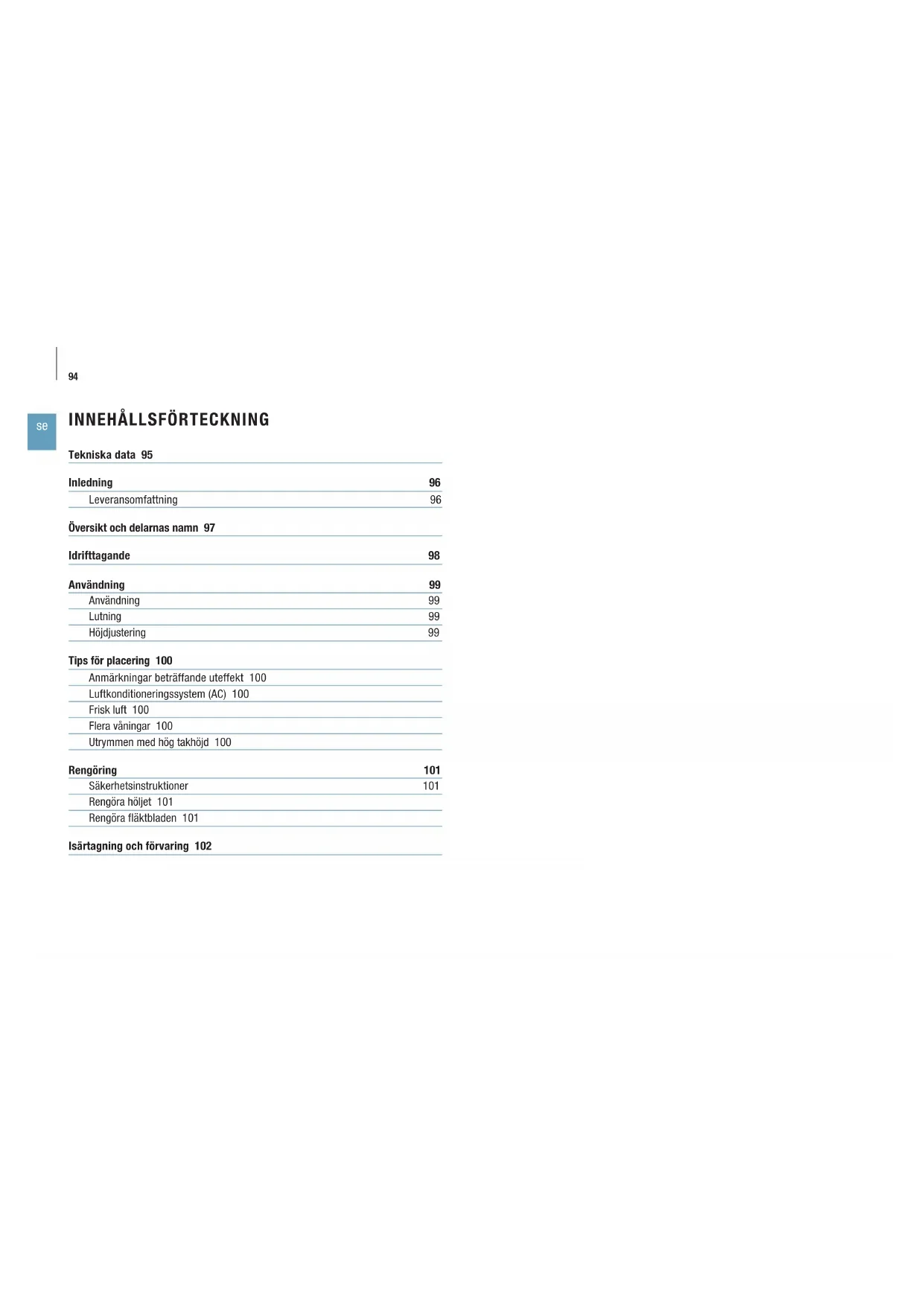 Tekniska data 95 Inledning 96 Leveransomfattning 96 Översikt och delarnas namn 97 Idrifttagande 98 Användning 99 Användning 99 Lutning 99 Höjdjustering 99 Tips för placering 100 Anmärkningar beträffande uteffekt 100 Luftkonditioneringssystem (AC) 100 Frisk luft 100 Flera våningar 100 Utrymmen med hög takhöjd 100 Rengöring 101 Säkerhetsinstruktioner 101 Rengöra höljet 101 Rengöra fläktbladen 101 Isärtagning och förvaring 10295