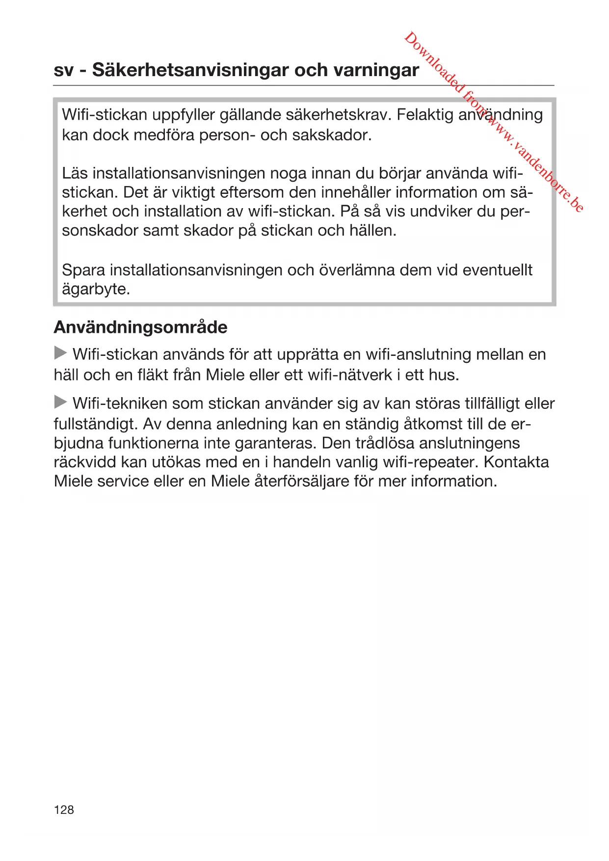 Wifi-stickan uppfyller gällande säkerhetskrav. Felaktig användning kan dock medföra person- och sakskador. Läs installationsanvisningen noga innan du börjar använda wifi- stickan. Det är viktigt eftersom den innehåller information om sä- kerhet och installation av wifi-stickan. På så vis undviker du per- sonskador samt skador på stickan och hällen. Spara installationsanvisningen och överlämna dem vid eventuellt ägarbyte. Användningsområde Wifi-stickan används för att upprätta en wifi-anslutning mellan en häll och en fläkt från Miele eller ett wifi-nätverk i ett hus. Wifi-tekniken som stickan använder sig av kan störas tillfälligt eller fullständigt. Av denna anledning kan en ständig åtkomst till de er- bjudna funktionerna inte garanteras. Den trådlösa anslutningens räckvidd kan utökas med en i handeln vanlig wifi-repeater. Kontakta Miele service eller en Miele återförsäljare för mer information. Downloaded from www.vandenborre.besv - Säkerhetsanvisningar och varningar