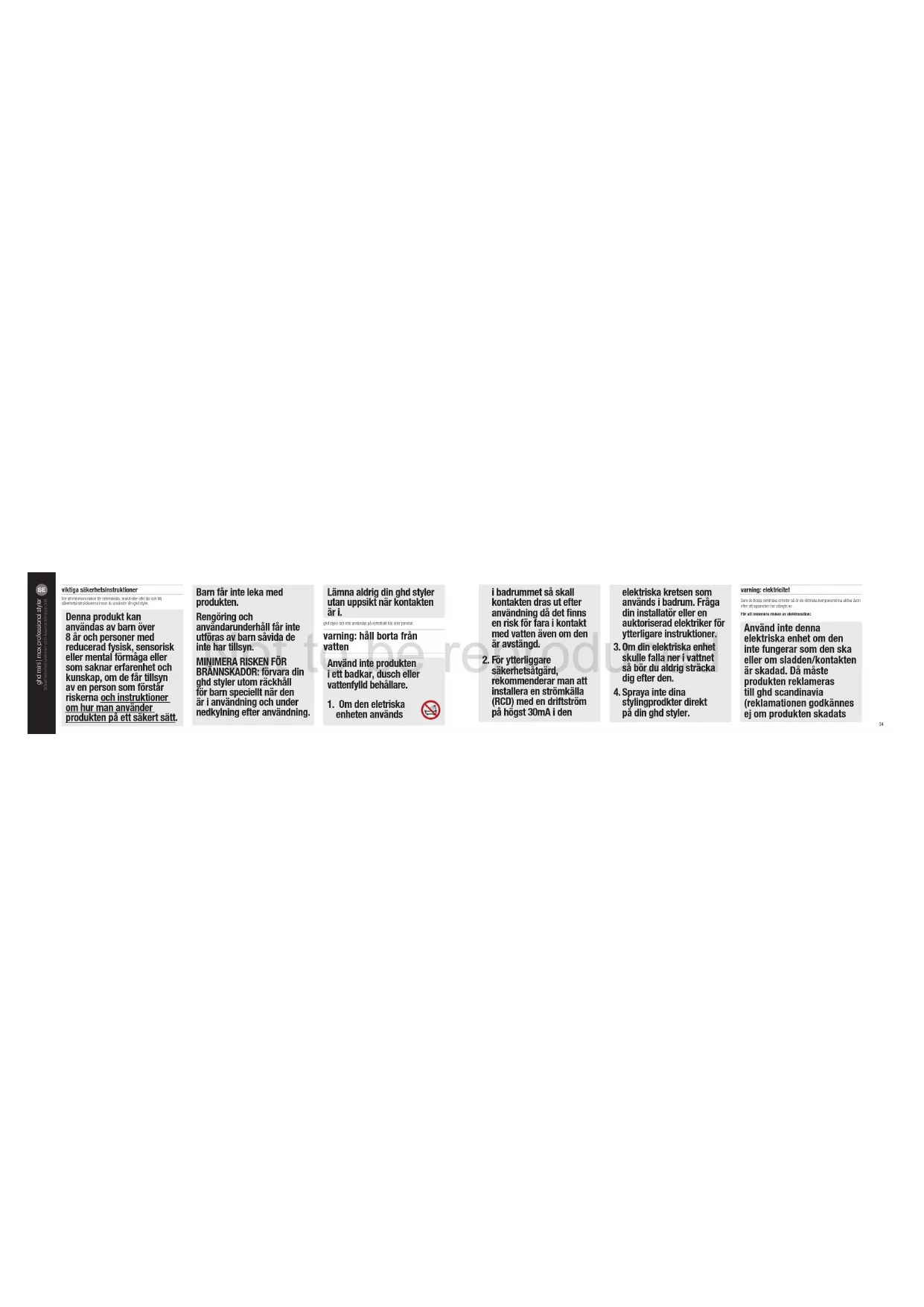 Spra ya inte dina stylingprodkter direkt på din ghd styler. varning: elektricitet Som de esta elektriska enheter så är de eletriska komponenterna aktiva även efter att apparaten har stängts av.För att minimera risken av elektrocution: Använd inte denna elektriska enhet om den inte fungerar som den ska eller om sladden/kontakten är skadad. Då måste produkten reklameras till ghd scandinavia (reklamationen godkännes ej om produkten skadats Not to be reproduced3635