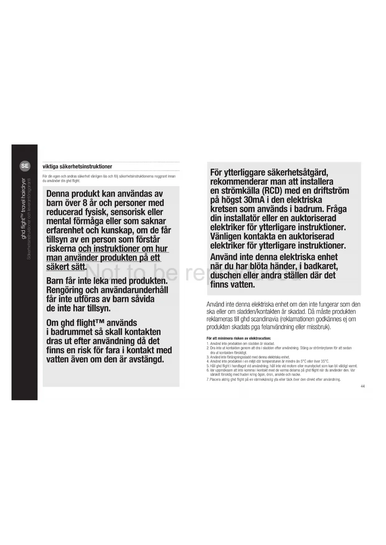 travel hairdryer Säkerhetsinstruktioner och leverantörsgaranti Not to be reproducedVIKTIGT: ghd ight är designad för 120/220-240V. Använd inte någon annan strömkälla än den rekommenderade.