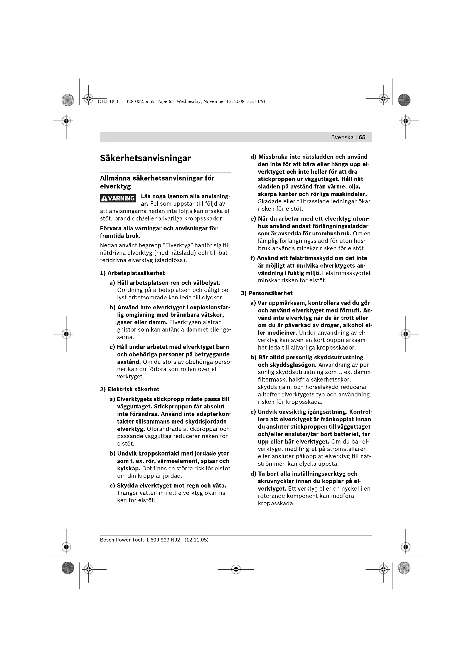 a) Var uppmärksam, kontrollera vad du gör och använd elverktyget med förnuft. An- vänd inte elverktyg när du är trött eller om du är påverkad av droger, alkohol el- ler mediciner. Under användning av el- verktyg kan även en kort ouppmärksam- het leda till allvarliga kroppsskador. b) Bär alltid personlig skyddsutrustning och skyddsglasögon. Användning av per- sonlig skyddsutrustning som t. ex. damm- filtermask, halkfria säkerhetsskor, skyddshjälm och hörselskydd reducerar alltefter elverktygets typ och användning risken för kroppsskada. c) Undvik oavsiktlig igångsättning. Kontrol- lera att elverktyget är frånkopplat innan du ansluter stickproppen till vägguttaget och/eller ansluter/tar bort batteriet, tar upp eller bär elverktyget. Om du bär el- verktyget med fingret på strömställaren eller ansluter påkopplat elverktyg till nät- strömmen kan olycka uppstå. d) Ta bort alla inställningsverktyg och skruvnycklar innan du kopplar på el- verktyget. Ett verktyg eller en nyckel i en roterande komponent kan medföra kroppsskada. VARNING OBJ_BUCH-428-002.book Page 65 Wednesday, November 12, 2008 3:21 PM66 | Svenska 1 609 929 N92 | (12.11.08) Bosch Power Tools e) Undvik onormala kroppsställningar. Se till att du står stadigt och håller balan- sen. I detta fall kan du lättare kontrollera elverktyget i oväntade situationer. f) Bär lämpliga arbetskläder. Bär inte löst hängande kläder eller smycken. Håll hå- ret, kläderna och handskarna på avstånd från rörliga delar. Löst hängande kläder, långt hår och smycken kan dras in av rote- rande delar. g) Vid elverktyg med dammutsugnings- och -uppsamlingsutrustning, se till att denna är rätt monterade och används på kor- rekt sätt. Användning av dammutsugning minskar de risker damm orsakar.
