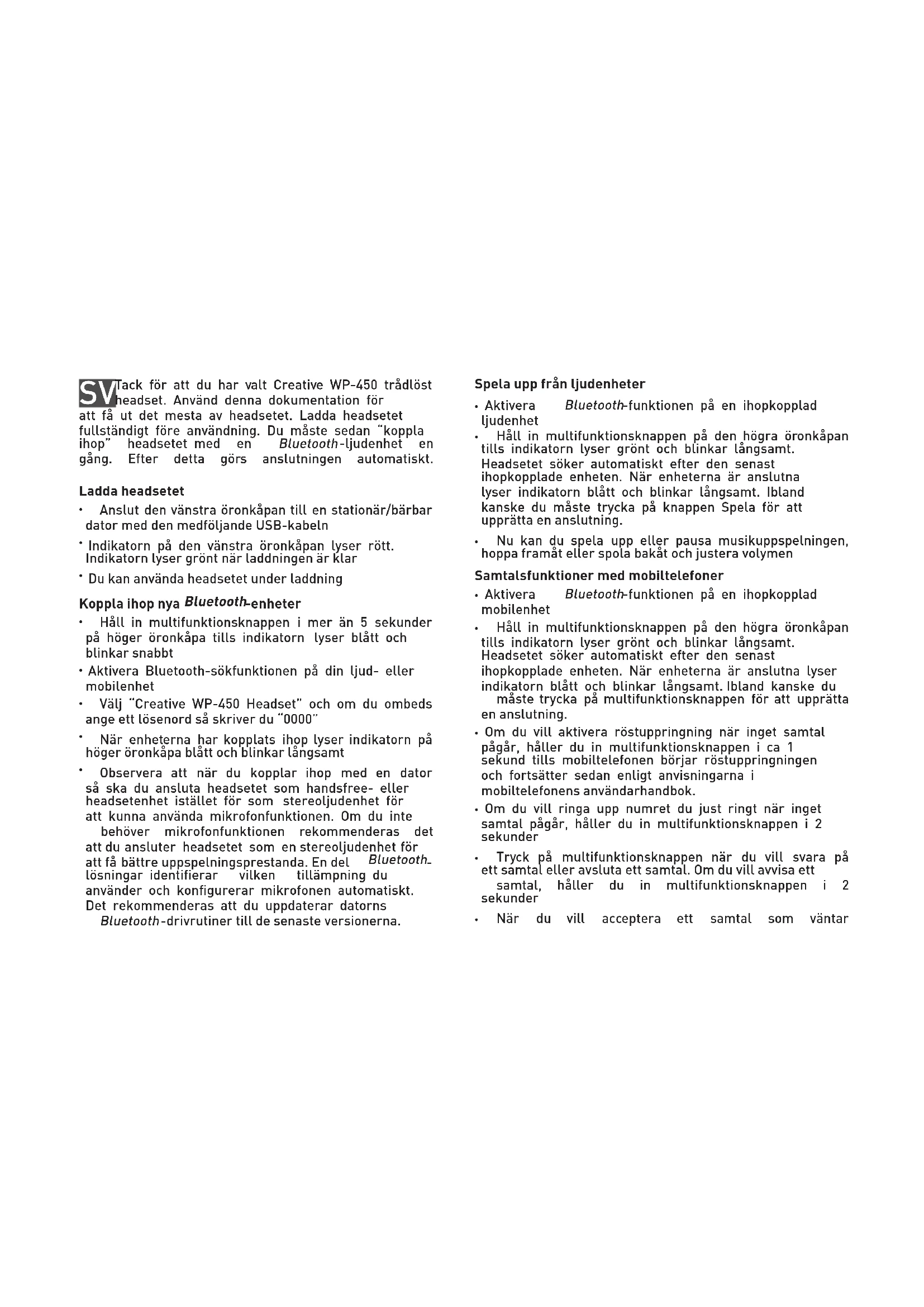 Tack för att du har valt Creative WP-450 trådlöst headset. Använd denna dokumentation för att få ut det mesta av headsetet. Ladda headsetet fullständigt före användning. Du måste sedan “koppla ihop” headsetet med en Bluetooth -ljudenhet en gång. Efter detta görs anslutningen automatiskt. Ladda headsetet
